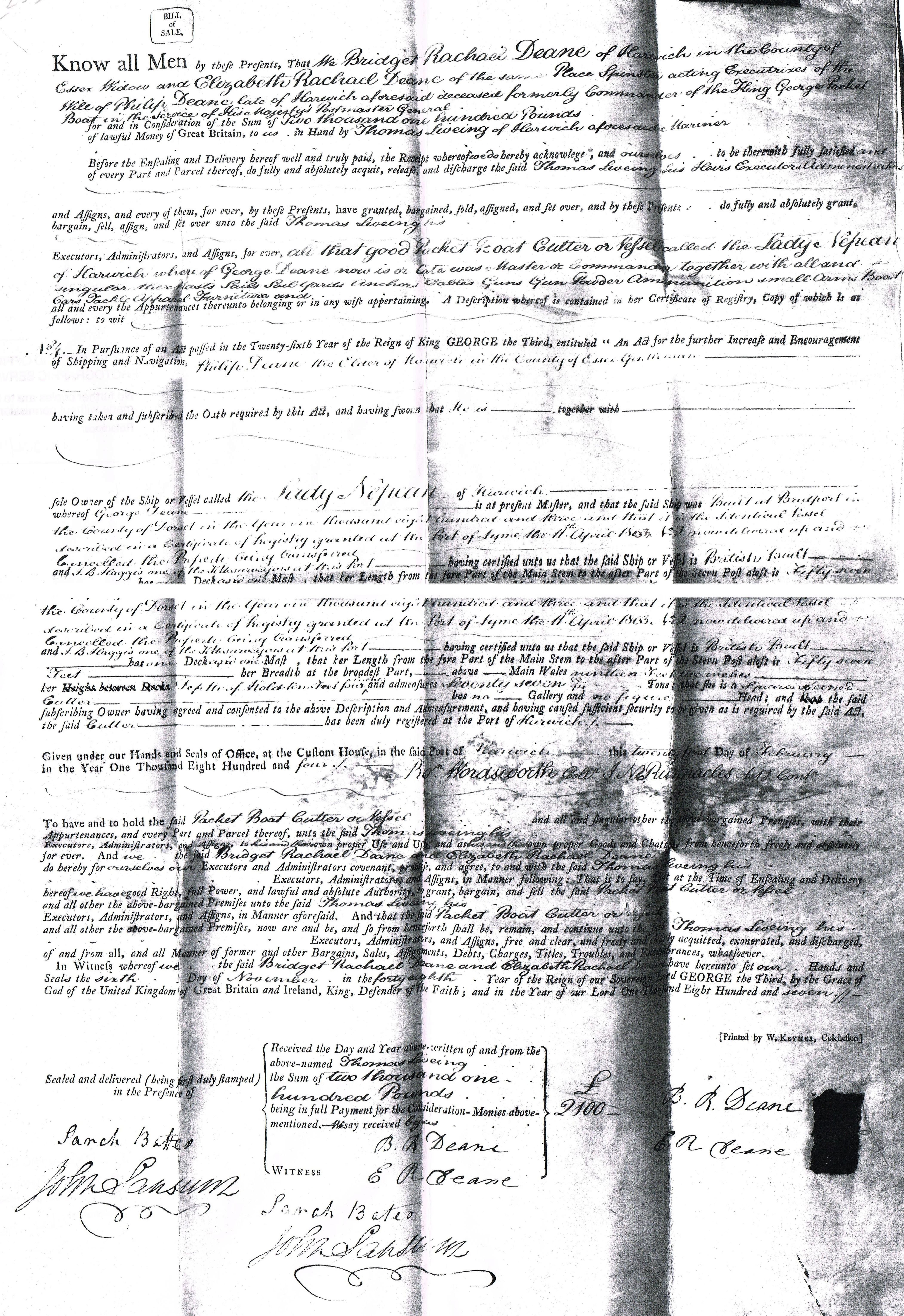 5. Thomas Liveing: Purchase of the Lady Nepean, 6 Nov 1807, Harwich ESS. DEED DEPOSITED BY GUILDHALL LIBRARY BILL of SALE. 6 November 1807 Bill of Sale: I Bridget Rachael Deane widow of Harwich and Elizabeth Rachael Deane spinster of Harwich, executors of the will of Philip Deane of Harwich, deceased, commander of the packet ship the 'King George' do in consideration of a sum of two thousand one hundred pounds (£2100) in the hand by William Liveing of Harwich mariner do sell assign . . . . . that good Packet Boat Cutter or Vessel called the 'Lady Nepean' of Harwich, built at Bridport, Dorset in 1803 with one deck and one mast, length of 57 feet, breadth of 19 feet 2 inches, hold 10 feet 2 inches deep, 77 tons, a square sterned cutter with no galley and no figurehead together with all masts sails sails yards anchors cables ropes cords guns gunpowder amunition small arms tackle apparel boats oars . . . . . to Thomas Liveing of Harwich, mariner, 6 November 1807. Signed: B R Deane E R Deane and other witnesses. Essex Record Office D/DU 206/11
