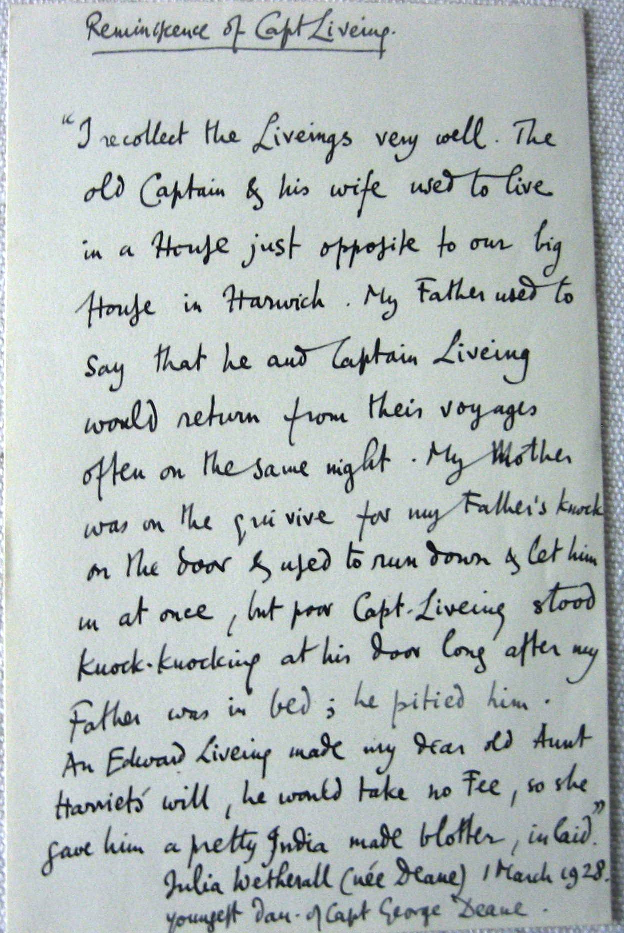 Reminiscence of Captain Liveing. "I recollect the Liveings very well.The old Captain and his wife used to live in a house just opposite to our big house in Harwich. My father used to say that he and Captain Liveing would return from their voyages often on the same night. My mother was on the qui vive1 for my father's knock on the door and used to run down and let him in at once, but poor Captain Liveing stood knock knocking at his door long after my father was in bed; he pitied him.. An Edward Liveing made my dear old aunt Harriet's will, he would take no fee, so she gave him a pretty India made blotter, inlaid" Julia Wetherall (nee Deane) 1 March 1928, youngest daughter of captain George Deane. This has been placed in Commander Thomas Liveing's file as the writer Julia Wetherall appears to be Julia Susanna Deane b1830 Harwich - d1931 Berks, father George Deane of Harwich. Married Rev Thomas M Wetherall 1858 in Harwich - Ancestry. 1. Qui vive - : Alert, Look out. - used in the phrase on the qui vive