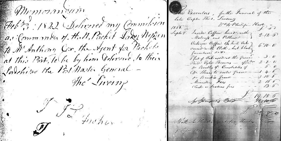 Memorandum Feb 2nd 1822 Delivered my Commifsion as Commander of H M Packet Lady Nepean to Mr Anthony Cox the Agent for Packets at this Port to be by him delivered to their Lordships the Postmaster General. Thos Liveing T L Fisher Ref: D/DU 206/14 ESS RO