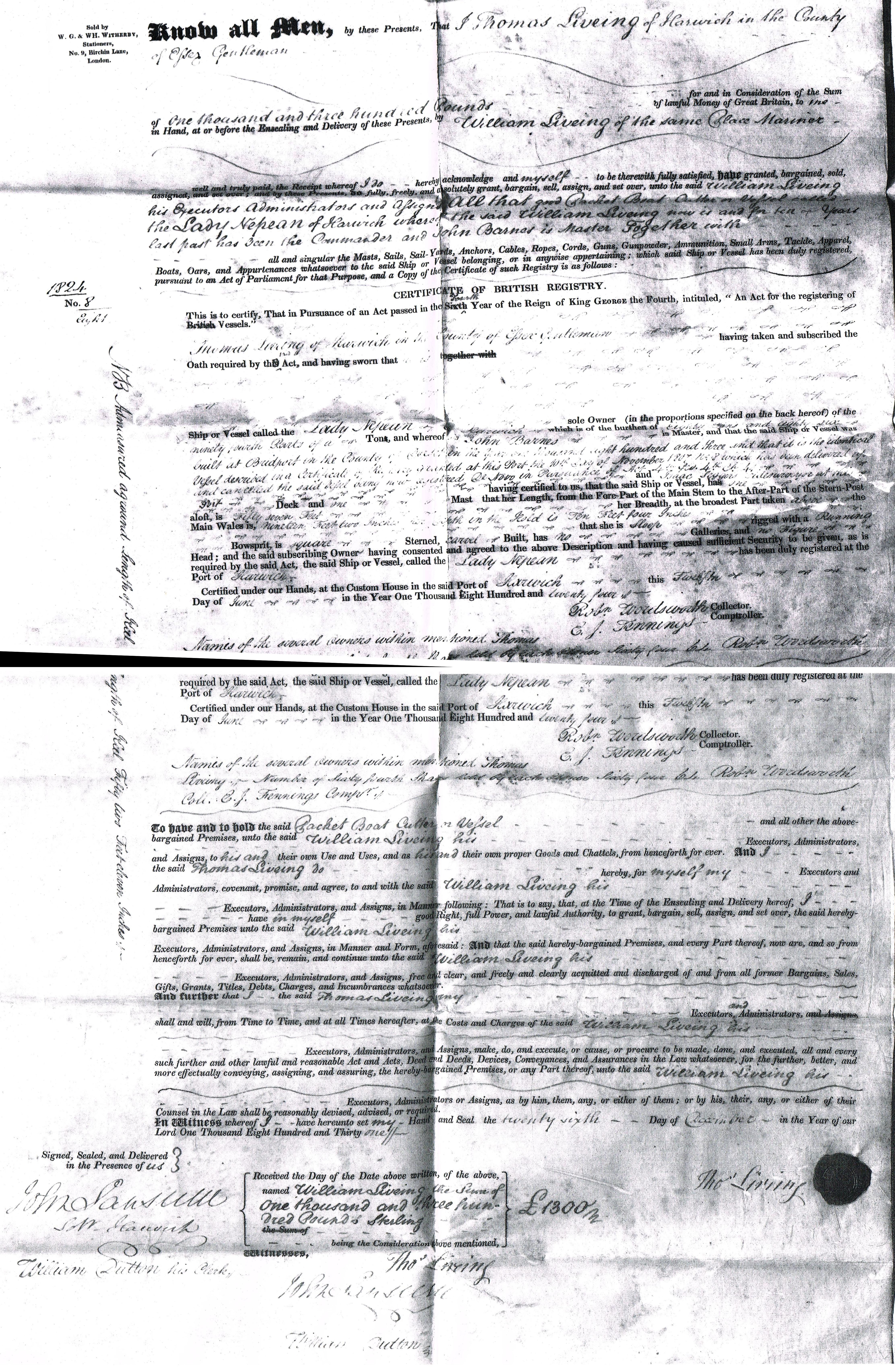 8. Thomas Liveing: Sale of Lady Nepean to William Liveing his son, 26 Dec 1831, Harwich ESS. DEED DEPOSITED BY GUILDHALL LIBRARY BILL of SALE. 26 December 1831 I Thomas Liveing of Harwich Gentleman in consideration of a sum of one thousand three hundred pounds (£1300) in the hand by William Liveing of Harwich mariner do sell assign . . . . . that good Packet Boat Cutter or Vessel called the Lady Neapean of Harwich (description of the vessel) together with all masts sails . . . . . to William Liveing of Harwich mariner who now is and for ten years last past has been the Commander and John Barnes the Master (of the Lady Nepean). . . . . 26 December 1831. Signed Thos Liveing and other witnesses. Essex Record Office D/DU 206/11 This I take to be a sale to William Liveing [136] his son, note it is £800 less than Thomas paid for the vessel.