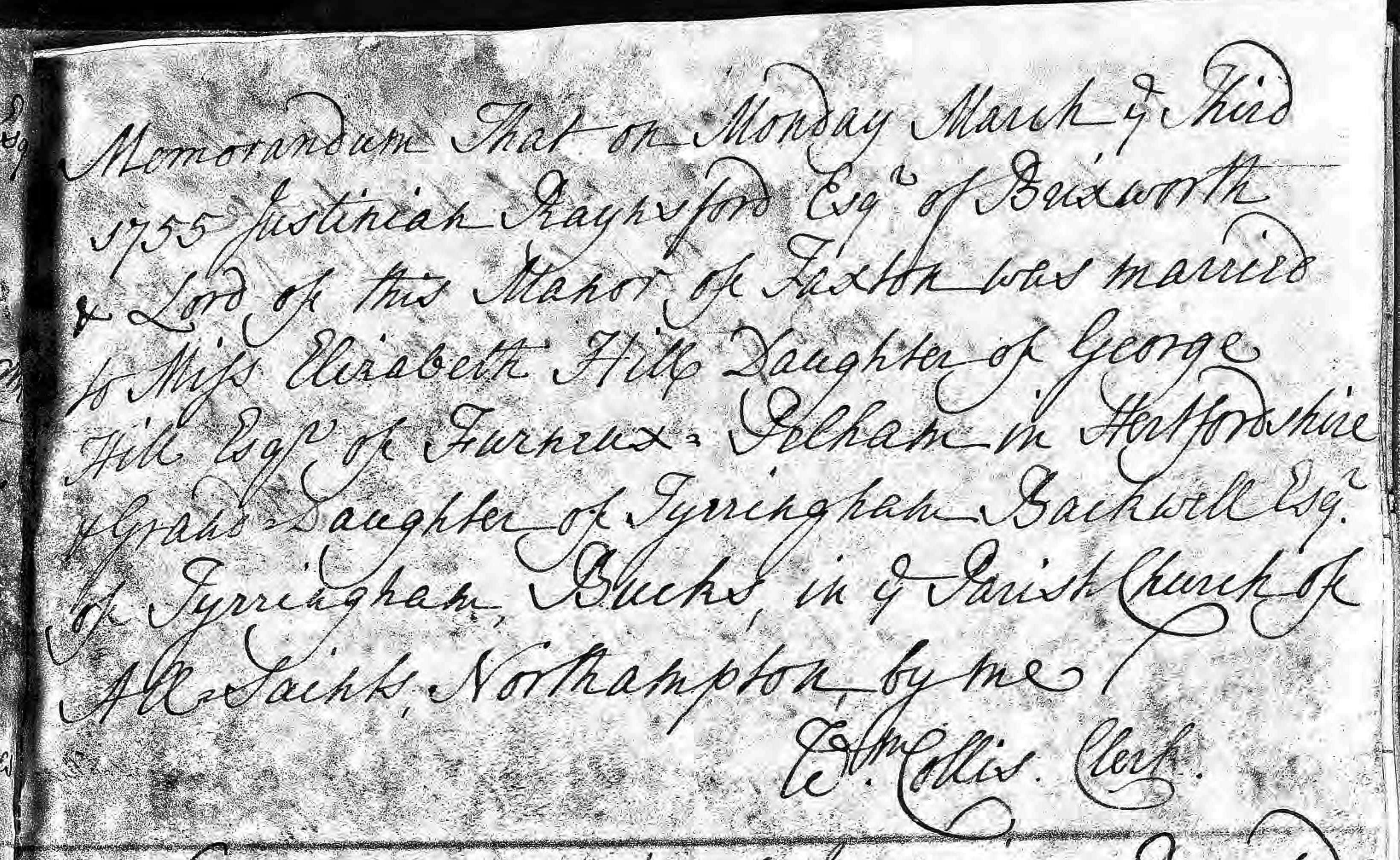 Elizabeth spouse unknown Juistinian RAYNSFORD of Brixworth Northants. [4039] [MRIN: 1390] on 3 Mar 1755 in All Saints Northampton NTH. |