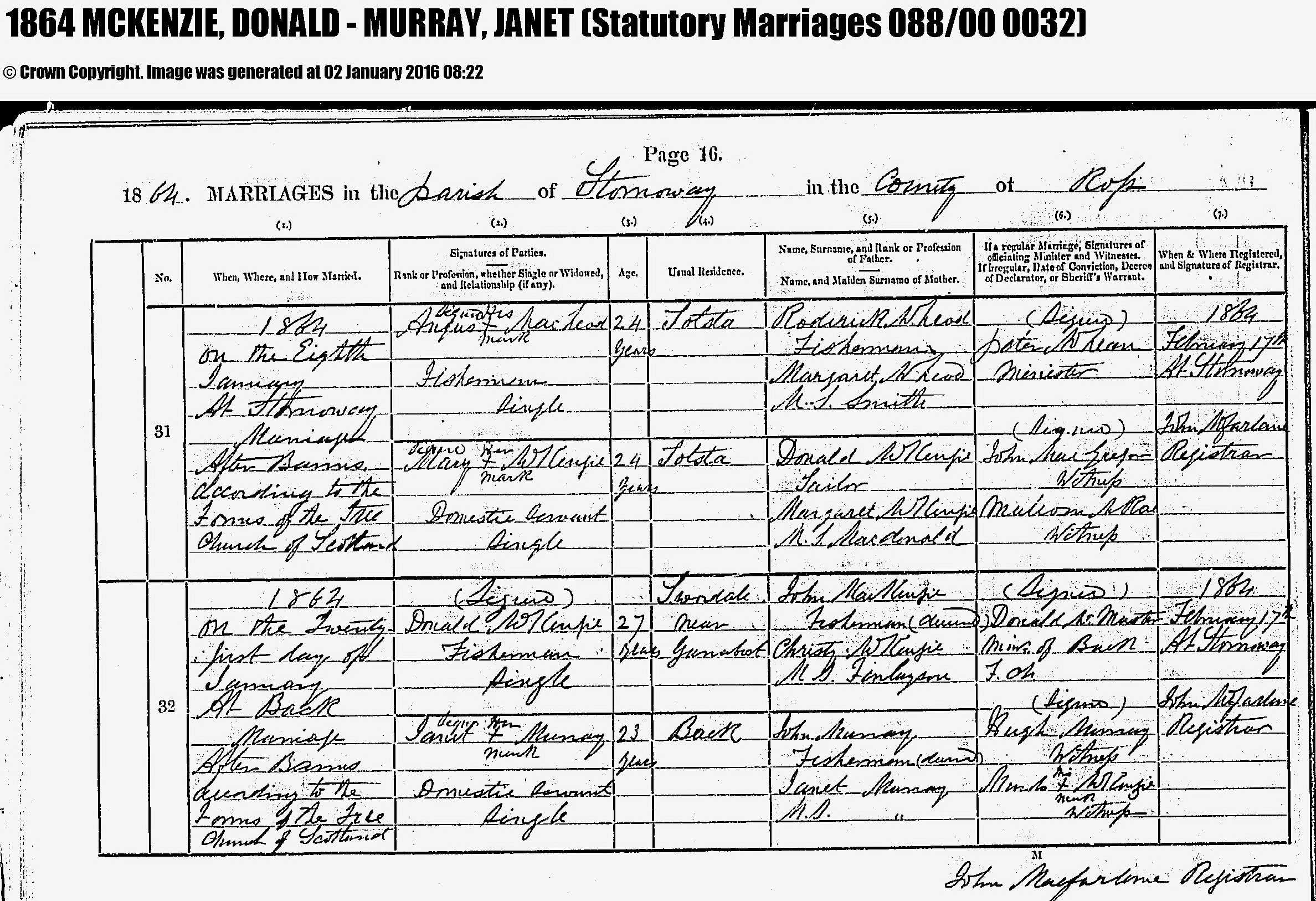Donald married Janet (Jessie) MURRAY [28157] [MRIN: 9966] on 21 Jan 1864 in Stornoway Lewis SCT. (Janet (Jessie) MURRAY [28157] was born in 1841 in Stornoway Lewis SCT and died on 11 Oct 1932 in Stornoway Lewis SCT.) |