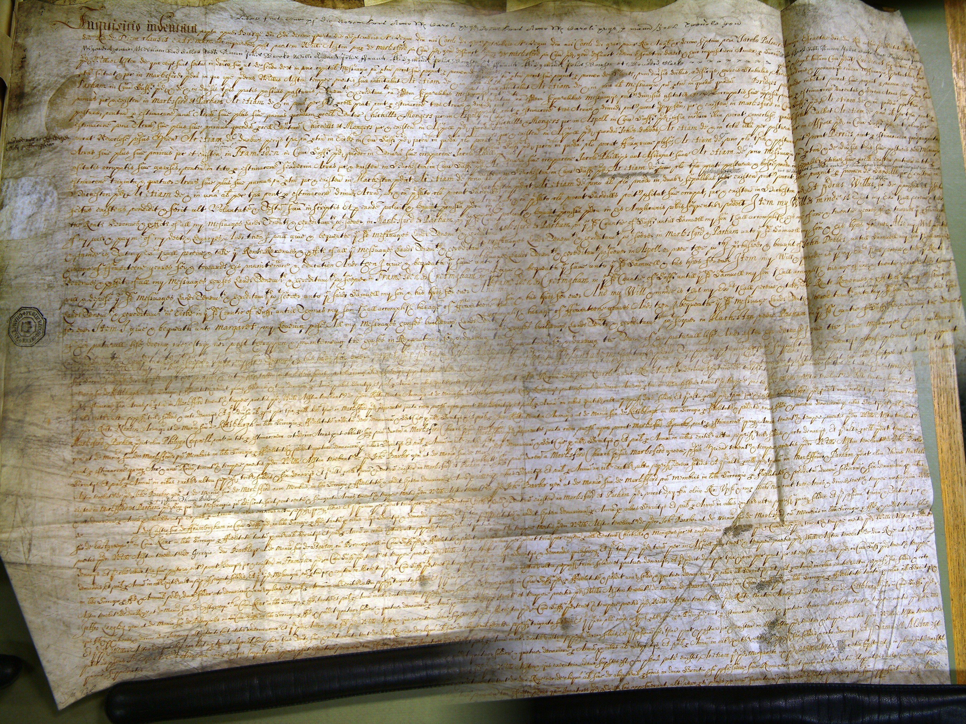 1. William Alston: Inquisition Post Mortem, 1641, Bury St Edmunds SFK. WILLIAM ALSTON, Gentleman. Inquisition Post Mortem taken at Bury St. Edmund's. 4 September 17 Charles i. (1641). Ser.ii Vol 497, No 61 1641 co. Suffolk. The said William was seised of a capital messuage known as Sherts, and land in Marlesford and Parham, held of Robert Nawton, Esq., as of his manor of Kettleburgh, and of John Barbor, as of his manor of Marlesford ; and messuages and land in Aspoll, Framesden and Hacheston, co. Suffolk. Part of his will is recited. He died II June 17 Charles i. (1641). Samuel Alston is his son and heir, and was 11 years old on the 10th January last. Avice, his daughter and executrix, and Margaret Alston his widow, are both surviving. Alstoniana pg 262 Images of I.P.M. in latin "Alston William 1641"