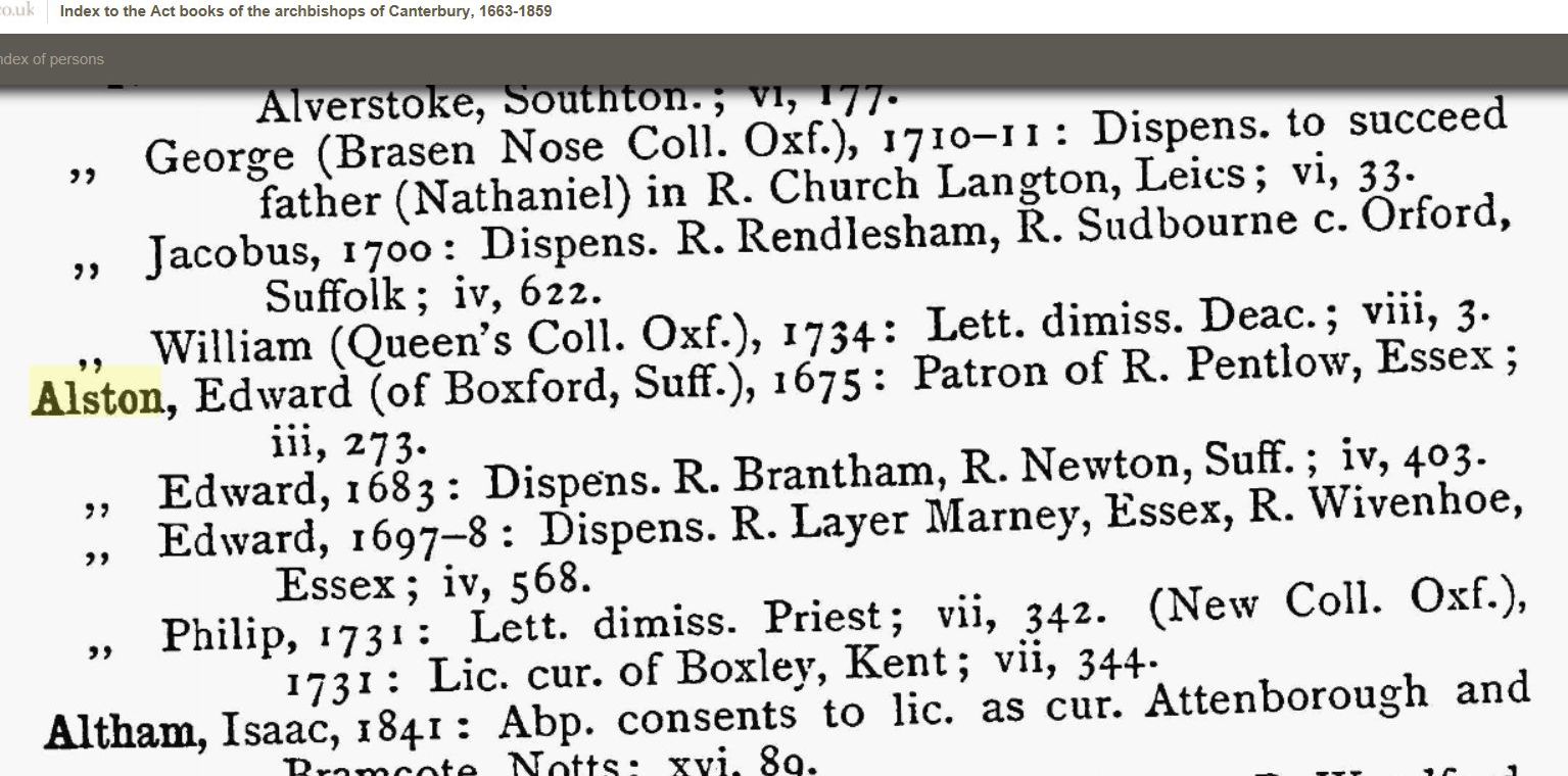 ALSTON (EDWARD), LL.B., incorp. 10 July, 1621 (one of this name rector of Pentlow, Essex, 1623, from which he was sequestered 1645). Fosters Alumni Oxoniensis 1891 Alstoniana Pg 348