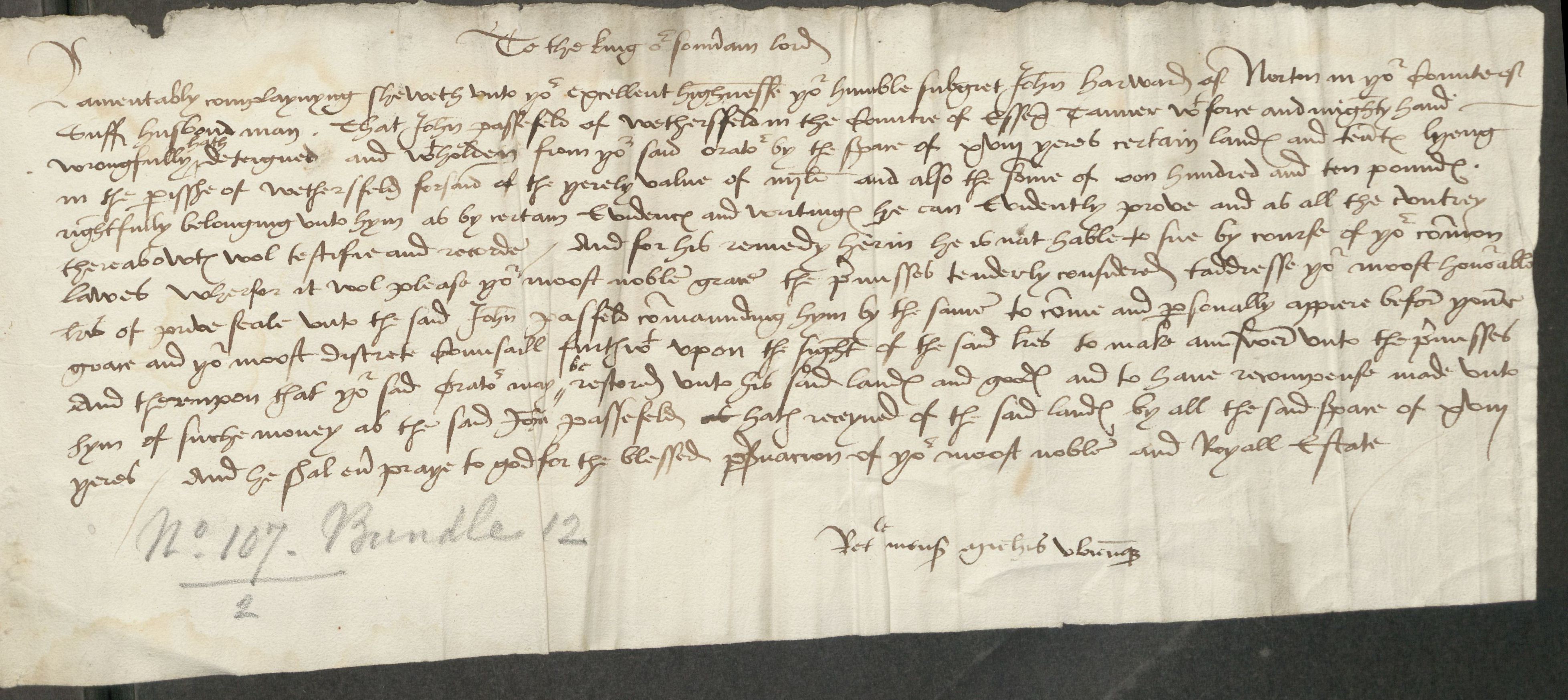 1. The National Archives, Kew: REQ 2/12/107/01, 22 Apr 1509-21 Apr 1510. Description: John Harward, husbandman of Norton, Suffolk, v John Passefeld, tanner of Wethersfield, Essex: lands and tenements in Wethersfield. 3 mm. [Standard surname: Pasfield] SMP Date: 1509 Apr 22-1510 Apr 21 Held by: </details/a/A13530124>