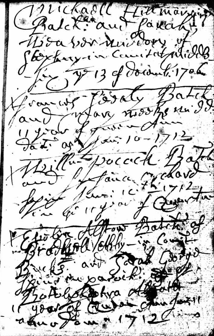 1. Clandestine marriage of Evelyn and Sarah, 11 Jan 1712/13, The Fleet London. Evelyn Alston of Bradwell Abbey in County of Bucks and Sarah George spinster of the Parish of St Botolph Aldersgate 11th year of Queen Ann Jan 11 anno domini 1712 TNA RG 7/819