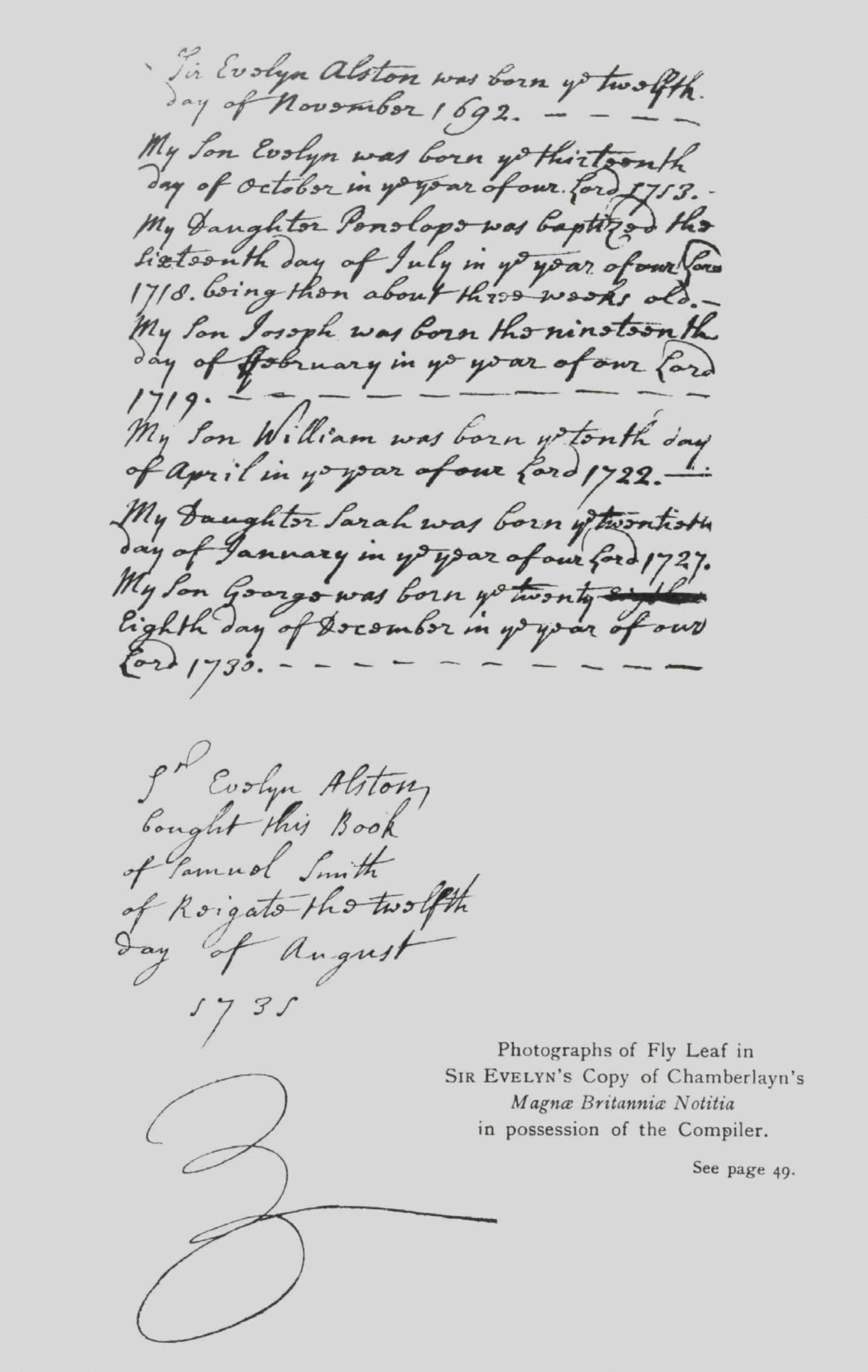 2. Sir Evelyn Alston: Notes on his family, Cir 1735. Noted in the fly leaf of Sir Evelyn Alston's copy of Chamberlayn's Magna Brittannia Notitia.