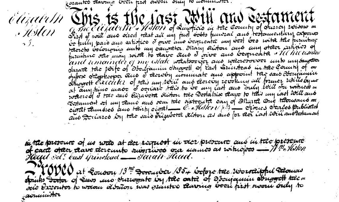 Elizabeth married William ALSTON [3285] [MRIN: 1115], son of Sir William ALSTON 8th Bart of Lingfield [3277] and Mary ROSE [3283], on 10 Sep 1793 in Lingfield Church SRY. (William ALSTON [3285] was born about 1772 in Lingfield SRY, died in 1802 and was buried on 25 May 1802 in Family Vault Lingfield Churchyard.) |