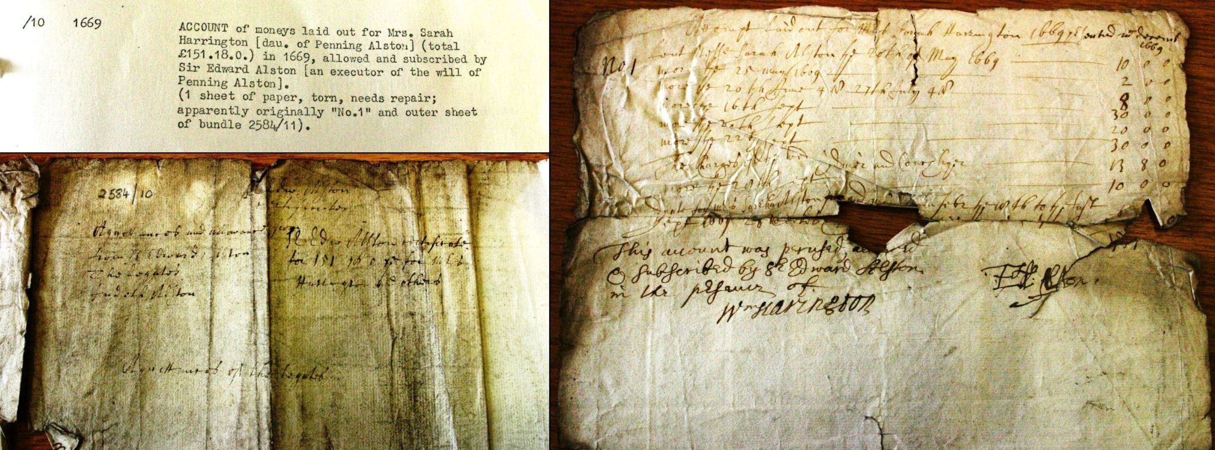 1. Will of Penning Alston: Account of Moneys for Sarah Harrington daughter of Penning, 1669.