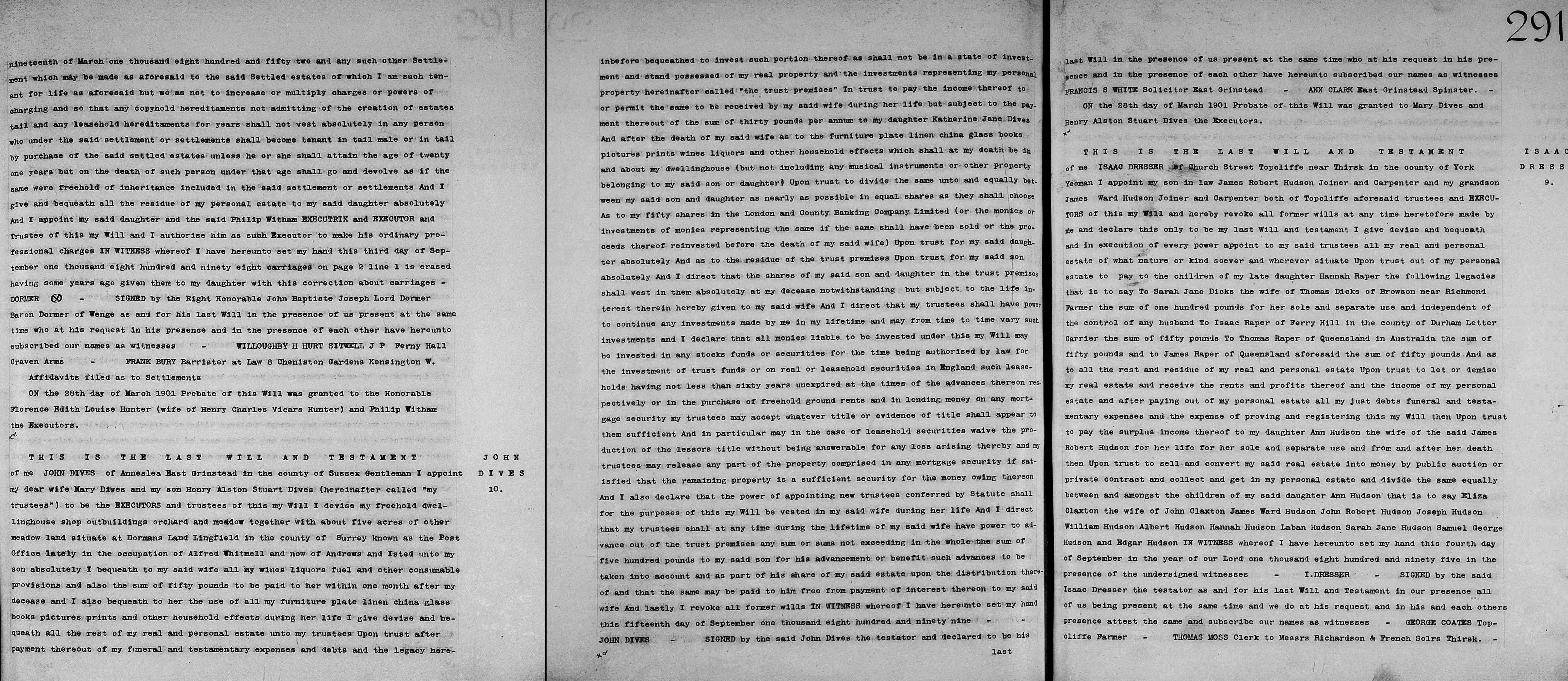 5. John Dives: Will & Probate, 28 Mar 1901. THIS IS THE LAST WILL AND TESTAMENT of me JOHN DIVES of Anneslea East Grinstead in the county of Sussex Gentleman I appoint my dear wife Mary Dives and my son Henry Alston Stuart Dives (hereinafter called "my trustees") to be the EXECUTORS and trustees of this my Will I devise my freehold dwellinghouse shop outbuildings orchard and meadow together with about five acres of other meadow land situate at Dormans Land Lingfield in the county of Surrey known as the Post Office lately in the occupation of Alfred Whitmell and now of Andrews and Isted unto my son absolutely I bequeath to my said wife all my wines liquors fuel and other consumable provisions and also the sum of fifty pounds to be paid to her within one month after my decease and I also bequeath to her the use of all my furniture plate linen china glass books pictures prints and other household effects during her life I give devise and bequeath all the rest of my real and personal estate unto my trustees Upon trust after payment thereout of my funeral and testamentary expenses and debts and the legacy hereinbefore bequeathed to invest such portion thereof as shall not be in a state of investment and stand possessed of my real property and the investments representing my personal property hereinafter called "the trust premises" In trust to pay the income thereof to or permit the same to be received by my said wife during her life but subject to the payment thereout of the sum of thirty pounds per annum to my daughter Katherine Jane Dives And after the death of my said wife as to the furniture plate linen china glass books pictures prints wines liquors and other household effects which shall at my death be in and about my dwellinghouse (but not including any musical instruments or other property belonging to my said son or daughter) Upon trust to divide the same unto and equally between my said son and daughter as nearly as possible in equal shares as they shall choose As to my fifty shares in the London and County Banking Company Limited (or the monies or investments of monies representing the same if the same shall have been sold or the proceeds thereof reinvested before the death of my said wife) Upon trust for my said daughter absolutely And as to the residue of the trust premises Upon trust for my said son absolutely And I direct that the shares of my said son and daughter in the trust premises shall vest in them absolutely at my decease notwithstanding but subject to the life interest therein hereby given to my said wife And I direct that my trustees shall have power to continue any investments made by me in my lifetime and may from time to time vary such investments and I declare that all monies liable to be invested under this my Will may be invested in any stocks funds or securities for the time being authorised by law for the investment of trust funds or on real or leasehold securities in England such lease-holds having not less than sixty years unexpired at the times of the advances thereon respectively or in the purchase of freehold ground rents and in lending money on any mortgage security my trustees may accept whatever title or evidence of title shall appear to them sufficient And in particular may in the case of leasehold securities waive the production of the lessors title without being answerable for any loss arising thereby andmy trustees may release any part of the property comprised in any mortgage security if satisfied that the remaining property is a sufficient security for the money owing thereon And I also declare that the power of appointing new trustees conferred by Statute shall for the purposes of this my Will be vested in my said wife during her life And I direct that my trustees shall at any time during the lifetime of my said wife have power to advance out of the trust premises any sum or sums not exceeding in the whole the sum of five hundred pounds to my said son for his advancement or benefit such advances to be taken into account and as part of his share of my said estate upon the distribution there-of and that the same may be paid to him free from payment of interest thereon to my said wife And lastly I revoke all former wills IN WITNESS whereof I have hereunto set my hand this fifteenth day of September one thousand eight hundred and ninety nine JOHN DIVES SIGNED by the said John Dives the testator and declared to be his last Will in the presence of us present at the same time who at his request in his presence and in the presence of each other have hereunto subscribed our names as witnesses Francis S WHITE Solicitor East Grinstead ANN CLARK East Grinstead Spinster ON the 28th day of March 1901 Probate of this Will was granted to Mary Dives and Henry Alston Stuart Dives the Executors.