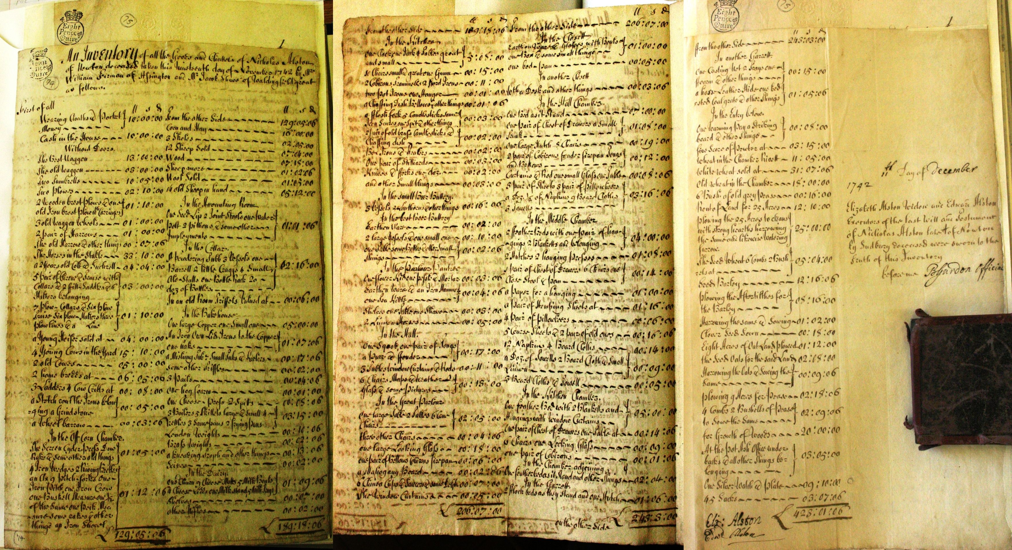 11th day of December 1742 Elizabeth Alston widow and Edward Alston executors of the last Will and testament of Nicholas Alston late of Newton by Sudbury deceased were sworn to the truth of this inventory.