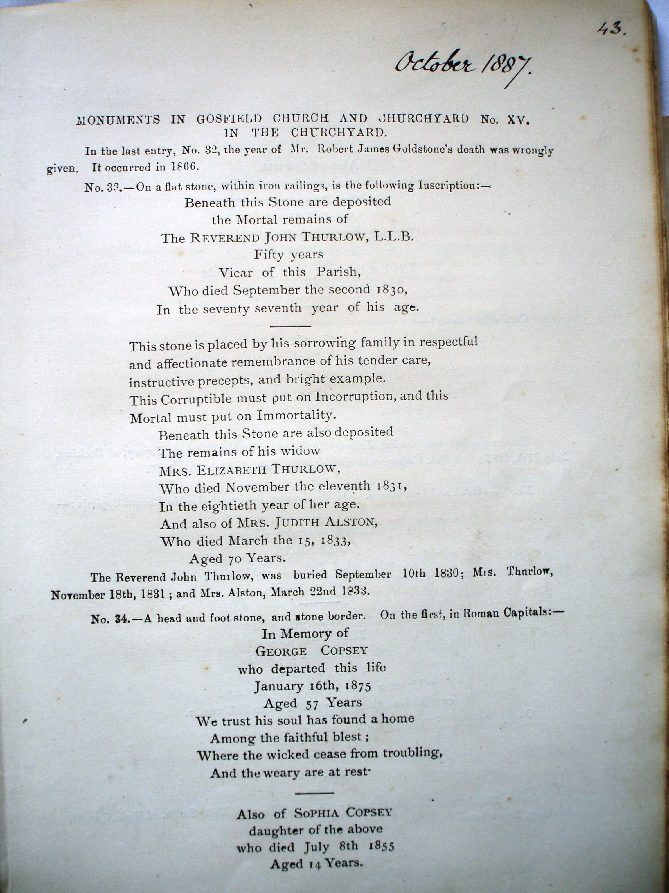 Elizabeth married Rev John THURLOW LLB [17695] [MRIN: 6393], son of Samuel THURLOW [17696] and Alice PATRICK [20967], on 9 Apr 1776 in Groton SFK. (Rev John THURLOW LLB [17695] was born on 3 Jan 1755 in Watton NFK, baptised on 5 Jan 1755 in Watton NFK, died on 26 Aug 1830 in The Vicarage Gosfield ESS and was buried on 10 Sep 1830 in St Catherine Gosfield, ESS.) |