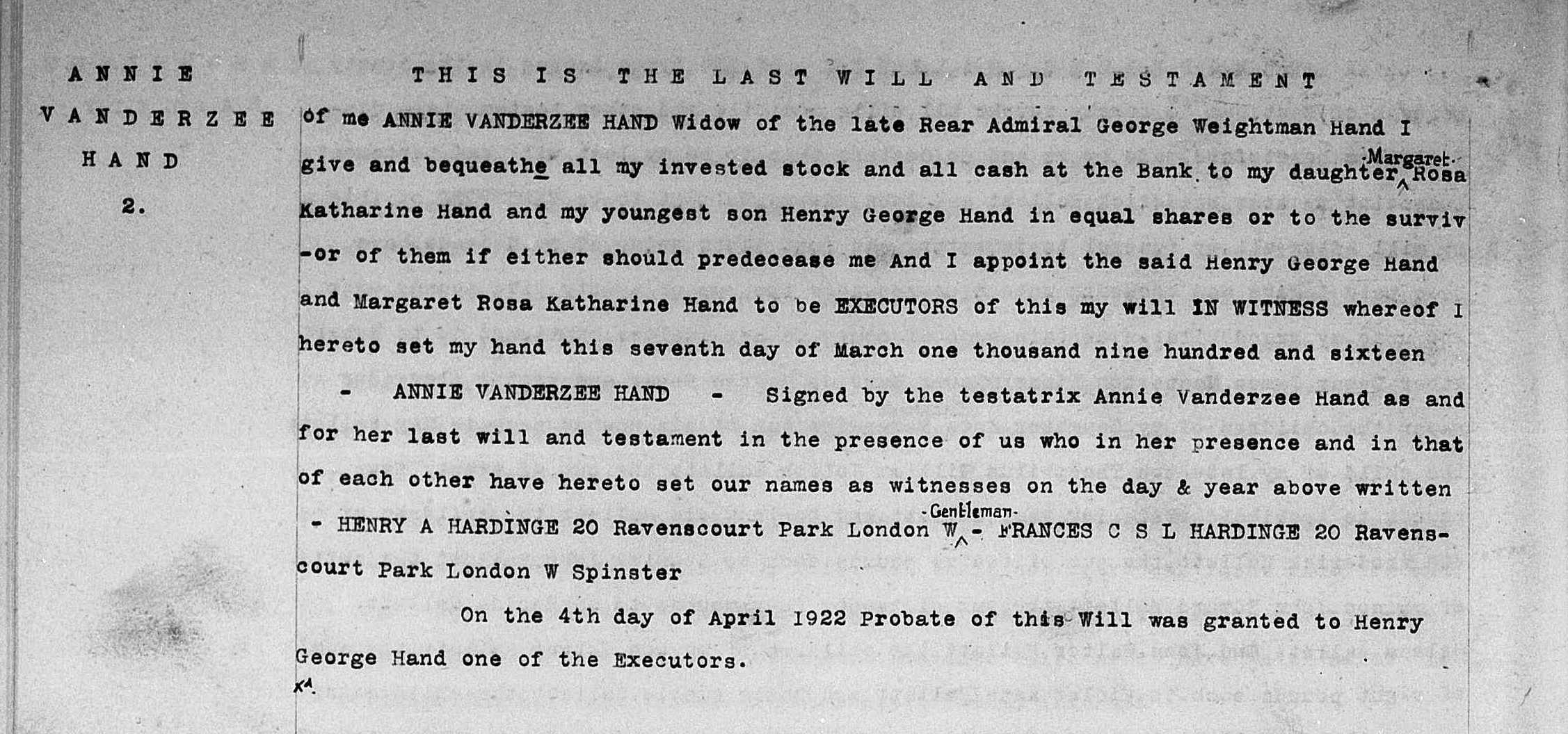 12. Annie Vanderzee Fenn: Will, 7 Mar 1916. THIS IS THE LAST WILL AND TESTAMENT of me ANNIE VANDERZEE HAND Widow of the late Rear Admiral George Weightman Hand I give and bequeathe all my invested stock and all cash at the Bank to my daughter Margaret Rosa Katharine Hand and my youngest son Henry George Hand in equal shares or to the survivor of them if either should predecease me And I appoint the said Henry George Hand and Margaret Rosa Katharine Hand to be EXECUTORS of this my Will IN WITNESS whereof I hereto set my hand this seventh day of March one thousand nine hundred and sixteen. ANNIE VANDERZEE HAND Signed by the testatrix Annie Vanderzee Hand as and for her last will and testament in the presence of us who in her presence and in that of each other have hereto set our names as witnesses on the day & year above written. HENRY A HARDINGE 20 Ravenscourt Park London W Gentleman. FRANCES C S L HARDINGE 20 Ravens-court Park London W Spinster On the 4th day of April 1922 Probate of this Will was granted to Henry George Hand one of the Executors.