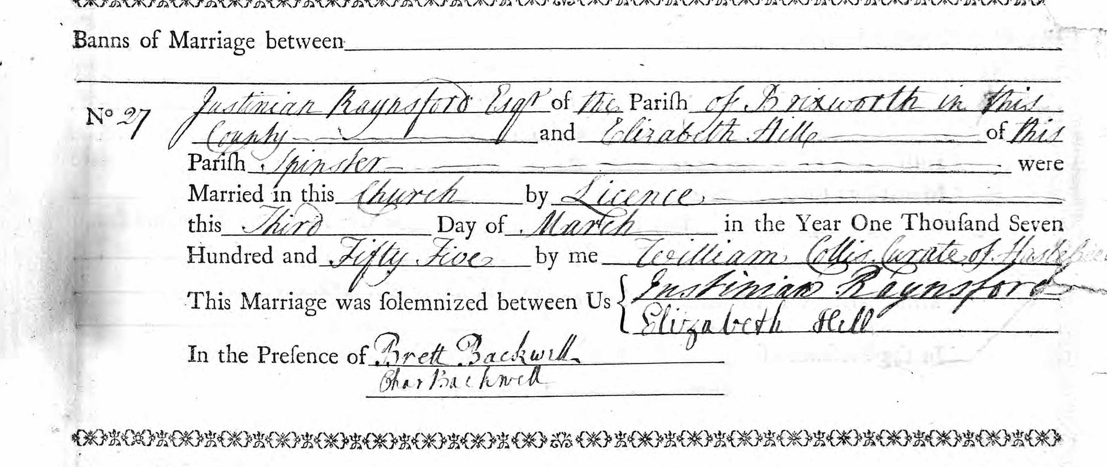 Juistinian spouse unknown Elizabeth HILL [25028] [MRIN: 1390], daughter of George HILL Esq of Furneux & Pelham HRT [25032] and Unknown, on 3 Mar 1755 in All Saints Northampton NTH. |