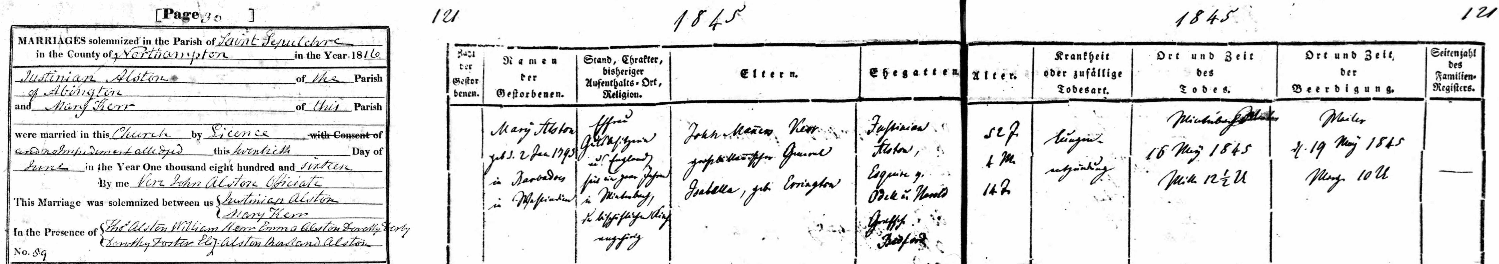 1. Mary Alston nee Kerr: Marriage Certificate & Death Certificate Schorndork Winterbach Germany. Mary married Justinian ALSTON [4041] [MRIN: 1391], son of Capt Thomas ALSTON [4036] and Elizabeth RAYNSFORD [4038], on 20 Jun 1816 in St Sepulchre Northampton. (Justinian ALSTON [4041] was born in 1780, baptised on 19 Oct 1780 in Wootton by Bedford BDF and died on 11 Jan 1848 in Schorndorf Winterbach nr Stuttgart Germany.) |
