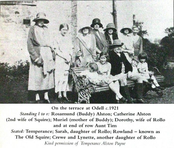 Family on Terrace at Odell 1921 Standing L to R: Rosamund (Buddy) Alston, Catherine Alston (2nd wife of Squire), Muriel mother of Buddy, Dorothy wife of Rollo and at the end Aunt Tim. Seated. L to R: Temperance, Sarah daughter of Rollo, Rowland known as the old Squire, Crewe and Lynette another daughter of Rollo. (Kind permission of Temperance Alston Payne)