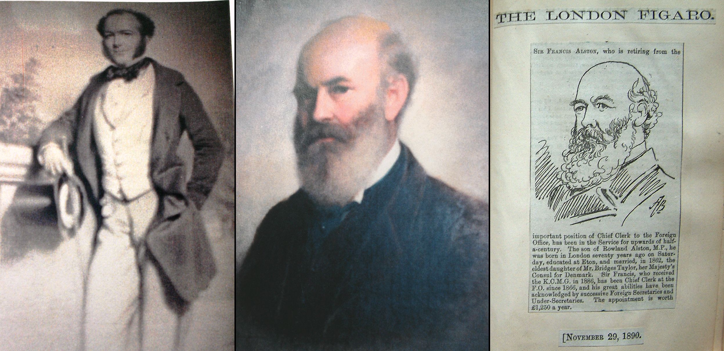 ALSTON, SIR FRANCIS B., K.C.M.G.(1820-1905): Senior Clerk, Russian Department, Foreign Office, 1857-1859; Senior Clerk, Asiatic and U.S.A. Department, Foreign Office, 1859-1866; Chief, Clerk, Foreign Office, 1866-1890 http://www.gulabin.com/britishdiplomatsdirectory/pdf/britishdiplomatsdirectory.pdf