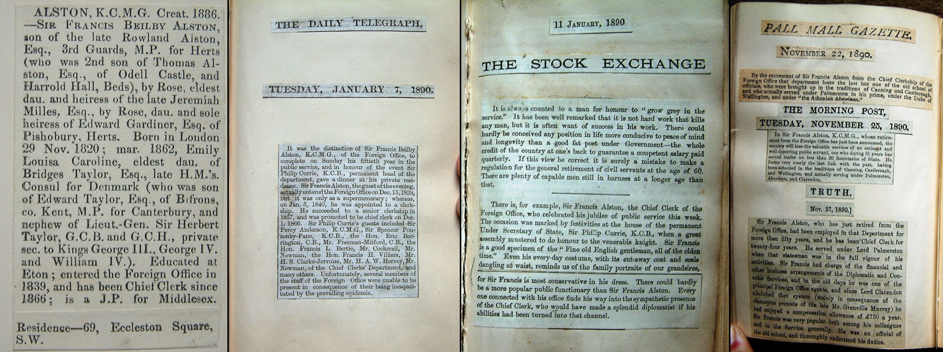 6. Francis Beilby Alston KCMG JP: His retirement after 50yrs at the Foreign Office (Clippings), 1890. FOREIGN OFFICE 1900 STATEMENT OF SERVICES. Alston Sir Francis Beilby K.C.M.G. was a Supernumerary Clerk in the Foreign. Office, from December 15, 1839, till January 5, 18??, when he was appointed to a Clerkship. Was some time in the Hertfordshire Militia. Succeeded to a Senior Clerkship, April 1, 1857. Was promoted to be Chief Clerk in the Foreign Office, December 1, 1866. Received a compensation allowance, December 1, 1870, on the abolition of Foreign Office Agencies. Was made a K.C.M.G., August 6, 1886. Retired on a pension, December 1, 1890. Is a Justice of the Peace for Middlesex.