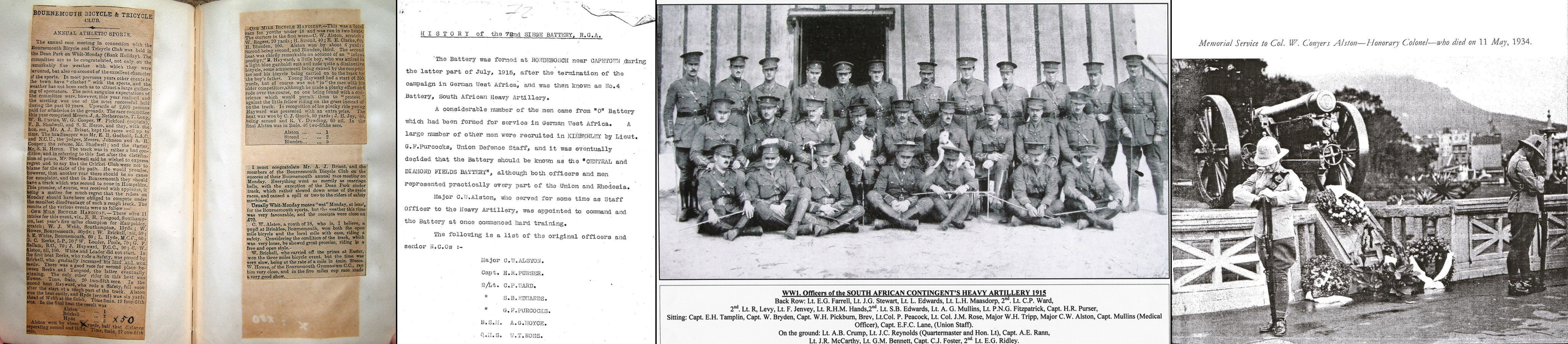 The Times 19 May 1934 pg 14 col E. Colonel Conyers Alston. Sir Charles Grant Robertson writes: Conyers Alston of whom an obituary notice appeared in The Times on Wednesday, was the son of Sir Francis Bielby Alston, of the Foreign Office. Educated at Rugby and the Queens College Oxford, he served in the South African War, the first in the Bucks Yeomanry and then in the RA. He returned to South Africa as a settler in 1903, and on the outbreak of the Great War in 1914 was given command of the Artillery Training Depot at the Cape. With Colonel Rose he raised the S.A.H.A. and came to the European front in August 1915. Severely wounded at Ypres, he served for 2 1/2 years in Egypt in command (as Lieutenant Colonel) of the Mustapha Depot and the camp at Sidi Bishr. He returned to South Africa in 1921 and took up fruit farming near Stellenbosch, and at once resumed a prominent and energetic part in public work, particularly in such organisations as the St Dunstan's Committee and the British Empire Service League, as the President of the War Star Club and the Farmers Association, and in varied political activities. He was an official representative of South Africa at the unveiling of the Delville Wood Memorial, gave the address at the memorial service in Cape Town, and as honorary colonel of the Cape Force Artillery unveiled the Artillery Memorial in Cape Town. Throughout his life his friendship to all who knew him was a perpetual inspiration. His charm of manner, his simplicity and integrity, his belief in a great British tradition of service, won for him a notable position in South Africa. Although he lost both an eye and an arm in the War, and his health was seriously undermined, he refused to give in, and continued to carry on with more success and courage than most men in good health. His death will be widely mourned in South Africa, for, indeed, he was a very gallant Christian gentleman. Noblesse oblige was in practice his principal throughout a life of high endeavour and unflinching obedience to duty.