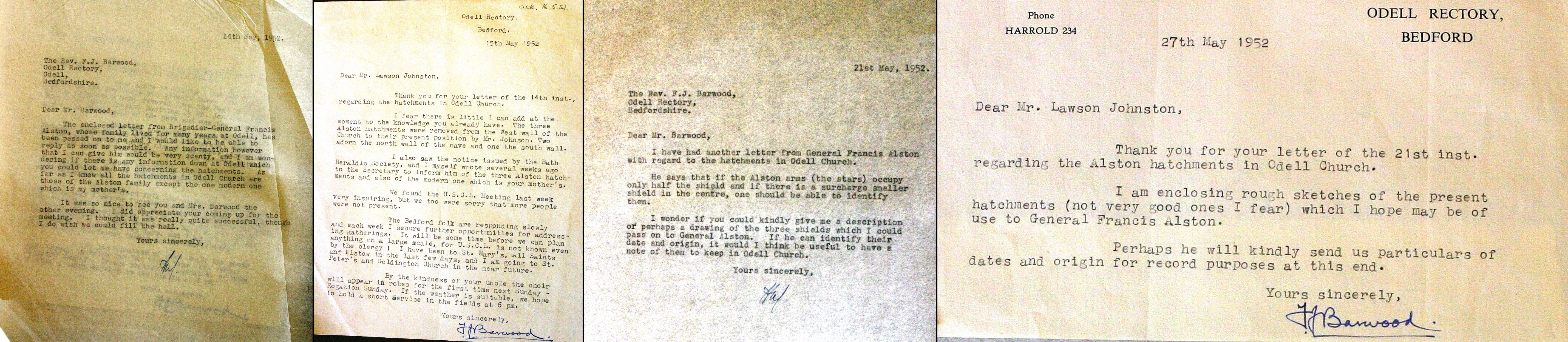 Odell Rectory, Bedford. Phone Harrold 234 27 May 1952. Dear Mr Lawson Johnston, Thank you for your letter of the 21st inst regarding the Alston hatchments in Odell church. I am enclosing rough sketches of the present hatchments (not very good ones I fear) which I hope may be of use to General Francis Alston. Perhaps he will kindly send us particulars of dates and origin for record purposes at this end. Yours sincerely FJ Barwood.