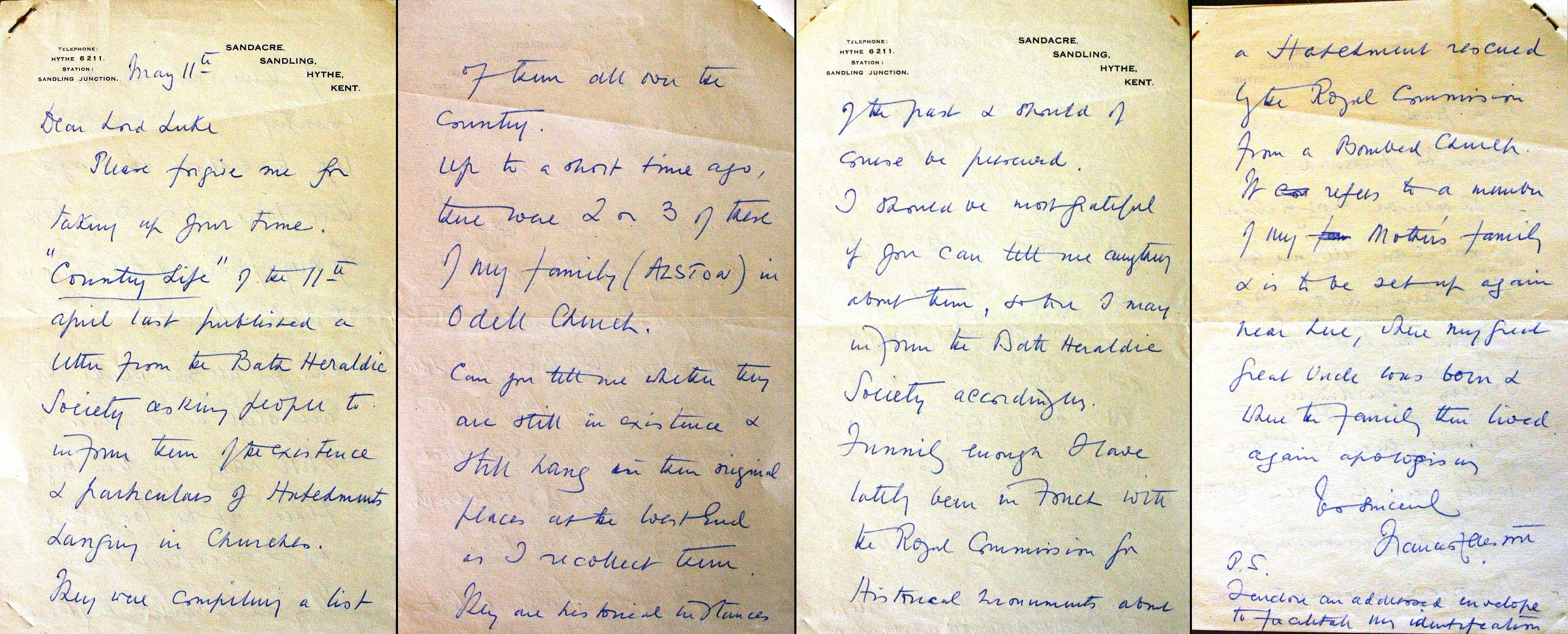 5. Letters Concerning Alston Hatchments in Odell Church: Frances Alston to Lord Luke, 11 May 1952. Sandacre, Sandling, Hythe, Kent Telephone: Hythe 6211. Station: Sandling Junction. May 11 Dear Lord Luke Please forgive me for taking up your time. "Country Life" of 11 April last published a letter from the Bath Heraldic Society asking people to inform them of the existence and particulars of hatchments hanging in churches. They are compiling a list Page 2. Of them all over the country. Up to a short time ago, there was 2 or 3 of these of my family (Alston) in Odell Church. Can you tell me whether they are still in existence and still hang in their original places at the West End as I recollect them. They are historical instances Page 3. of the past and should of course be preserved. I should be most grateful if you can tell me anything about them, so that I may inform the Bath Heraldic Society accordingly. Funnily enough I have lately been in touch with the Royal Commission for historical monuments about Page 4 a hatchment rescued by the Royal Commission from a bombed church. It refers to a member of my Mother's family and is to be set up again near here, where my great great uncle was born and where the family then lived. Again apologising Yours Sincerely Francis Alston PS I enclose an addressed envelope to facilitate my identification.