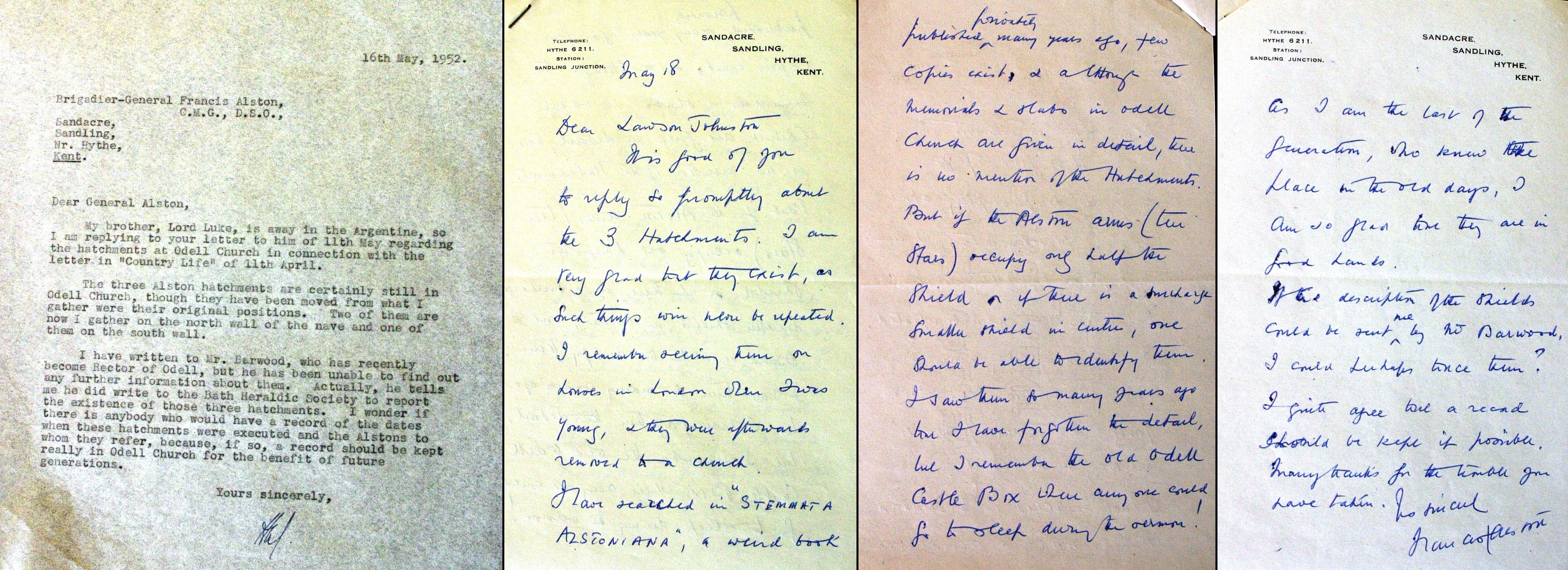 21 May 1952 The Rev F J Barwood, Odell Rectory, Bedfordshire. Dear Mr Barwood, I have had another letter from General Francis Alston with regard to the hatchments in Odell Church. He says that if the Alston arms (the stars) occupy only half the shield and if there is a surcharge smaller shield in the centre, one should be able to identify them. I wonder if you could kindly give me a description or perhaps a drawing of the three shields which I could pass on to General Alston. If he can identify their date and origin, it would I think be useful to have a note of them to keep in Odell Church. Yours sincerely HAL