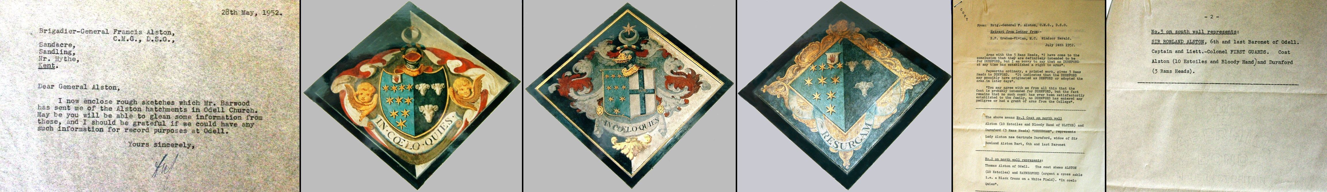 7. Letters Concerning Alston Hatchments in Odell Church: Lawson-Johnston - Francis Alston. Images of Hatchments, 28 May 1952. 28 May 1952 Brigadier General Francis Alston CMG, DSO. Sandacre, Sandling, Nr. Hythe, Kent. Dear General Alston, I now enclose rough sketches which Mr Barwood has sent me of the Alston Hatchments in Odell church. May be you will be able to glean some information from these, and I should be grateful if we could have any such information for record purposes at Odell. Yours sincerely, HAL