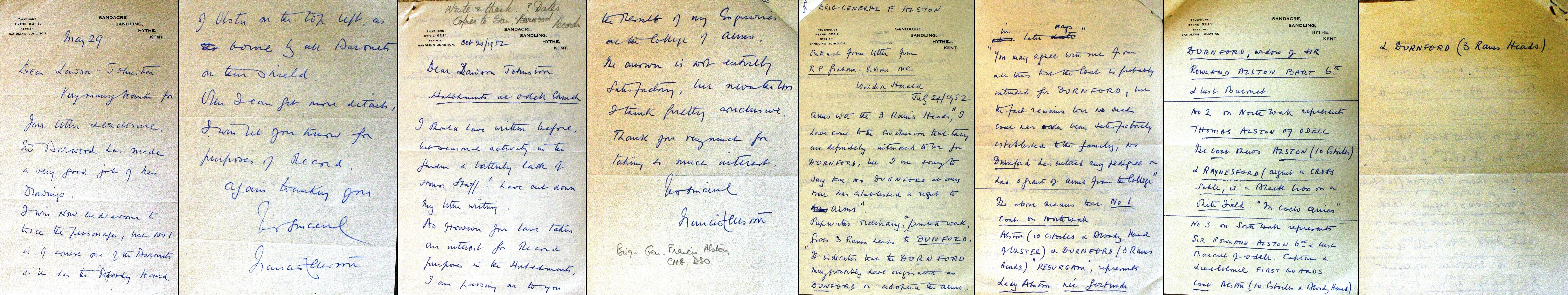 10. Letters Concerning Alston Hatchments in Odell Church: Francis Alston, Lawson-Johnston, Rev Barwood, 26 Oct - 28 Oct - 31 Oct - 17 Nov - 20 Nov 1952. Sandacre, Sandling, Hythe, Kent Telephone: Hythe 6211. Station: Sandling Junction. October 26th Dear Lawson Johnston Many thanks for your letter of 24 October. After posting my letter, I too remembered the dates! Rollo Alston told me once that the Registers had been destroyed by fire!. "Stemmata Alstoniana" published many years ago by a man called Cresswell prints a good many extracts. I can only give you the dates as I have found that both in that publication and in "The History And Antiquities of the Hundred of Willey in the County of Bedford" By W H Harvey Esq F.R. Historical Society printed in London 1872 - 78. The latter actually gives the existence of the Hatchments and Achievements on page 370. Numbers 1 and 2 "Alston impaling Sable 3 Rams Heads Cabossed argent armed or Durnford" Number 3 Alston impaling argent and cross sable Raynsford".