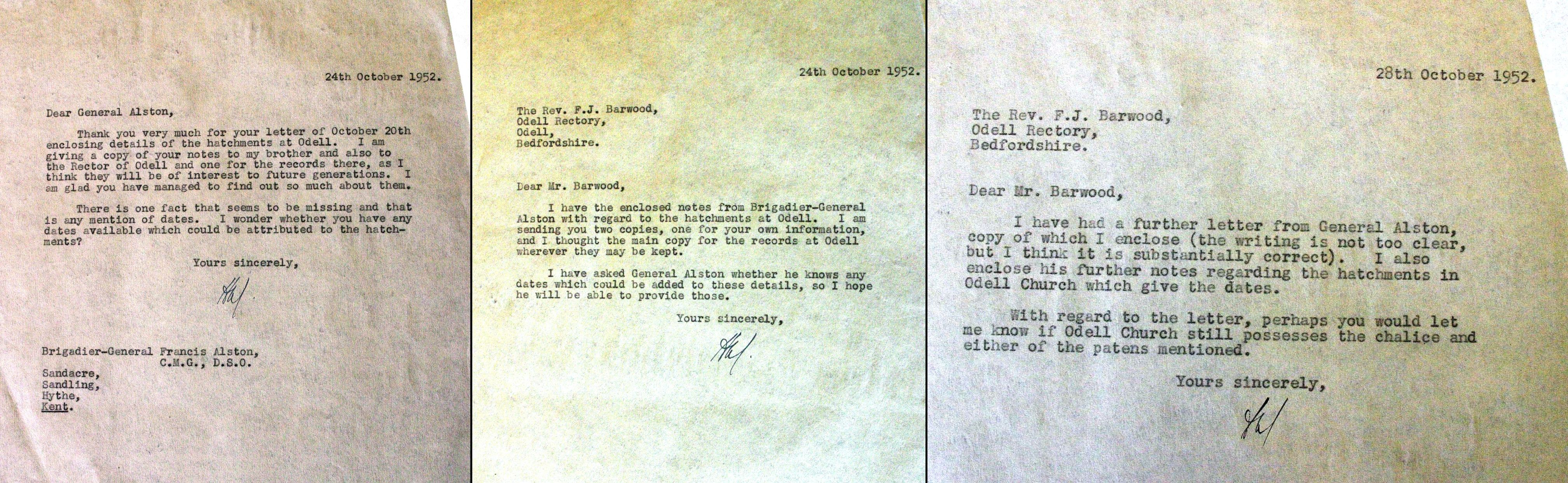 28 October 1952. The Rev FJ Barwood, Odell Rectory, Bedfordshire. Dear Mr Barwood, I have had a further letter from General Alston, (the writing is not too clear, but I think it is substantially correct). I also enclose his further notes regarding the Hatchments in Odell Church which gives the dates. With regard to the letter, perhaps you would let me know if Odell Church still possesses the chalice and either of the patens mentioned. Yours sincerely, HAL