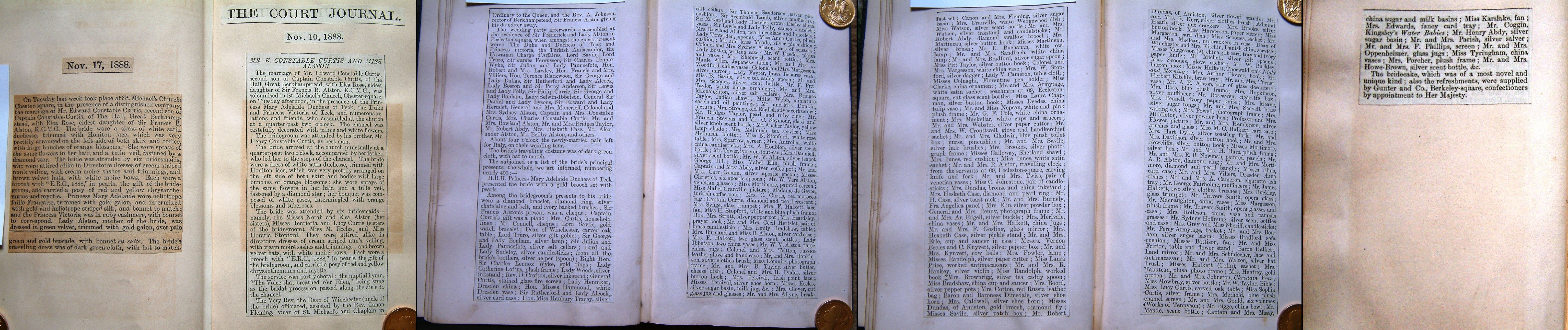 4. Marriage of Edward Curtis & Elca Alston, 6 Nov 1888, St Michael Chester Sq London. The Court Journal reports on the marriage in detail, note the details of the gifts - it is sad the young couple were not able to enjoy more than some nine months of marriage.