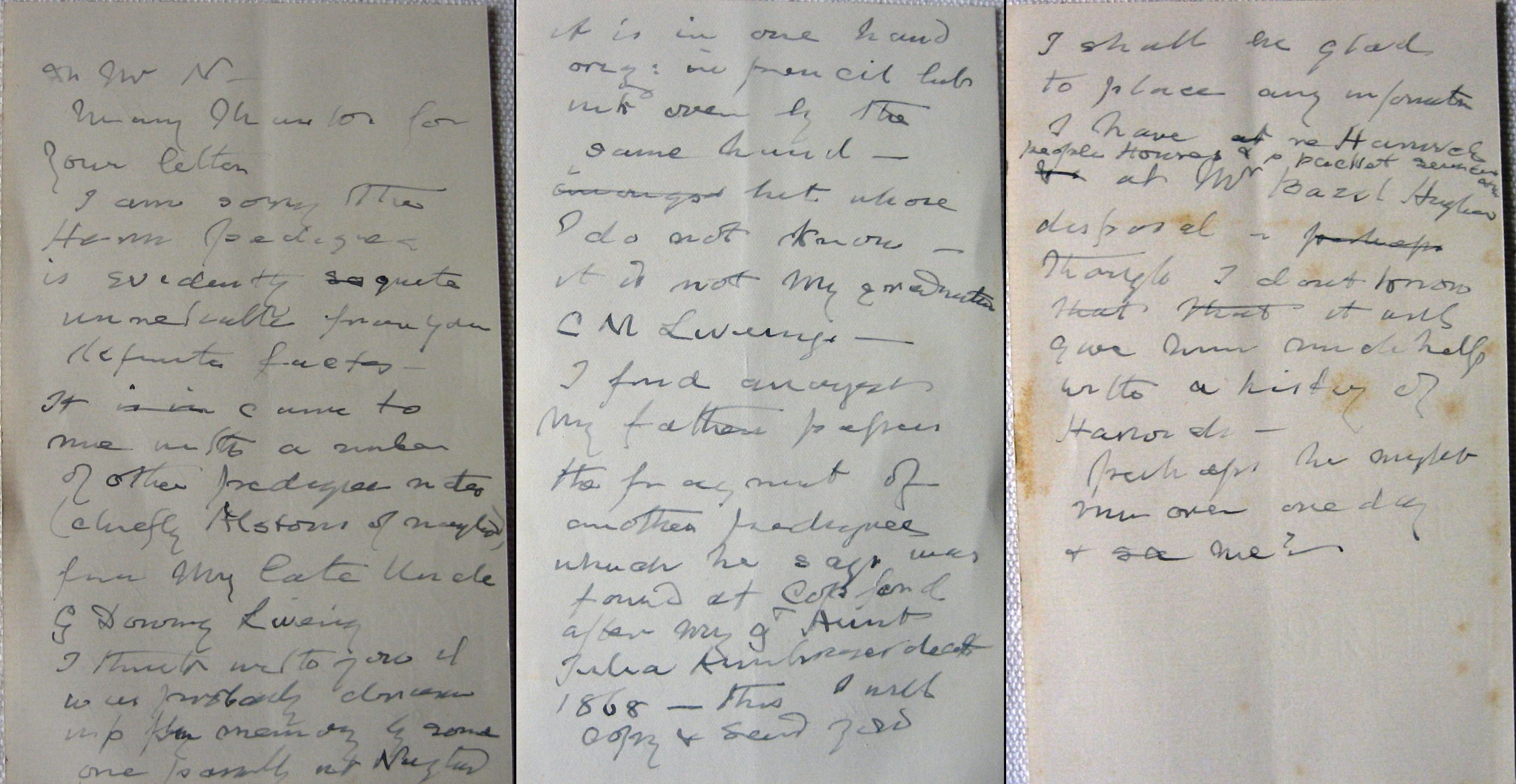 Dear cousin Isabella I am trying to complete a pedigree of the Liveing family. I have recently made several visits to Harwich to examine the registers of St Nicholas Church and the tombs and inscriptions there and have added somewhat to my previous knowledge of dates and facts \endash the pedigree is early back to our Gt Gt Gt grandfather Robert Liveing born 1684 died 1745 and his wife Martha on 1670 died 1748 there only child (incorrect) Robert Liveing father of old Captain Thomas Liveing. Tradition suggests (1) Robert Liveing's father was one John Liveing and that he came from Saffron Walden or Hadleigh but I have so far been unable to trace him Also I am writing to you in the hope you will kindly help me with the dates of births and deaths in your family ................... I have been unable to trace what became of the Harrold family Bible, I mean Thomas Liveing's bible I suppose you do not know who has it .................... I have however the dates of births and deaths of all Captain Thomas Liveing's children except that of your grand mother Harriet Liveing (Aunt Fenn) and I don't know where she died I mean the full names of your brothers and sisters with dates of births and of death if deceased, who they married the names and dates of their children. Since my father's death I have been reading & sorting our collection of family letters mourning rings from 1797 to the present time and collected by Aunt Ambrose and Uncle Henry and my father I also have 2 of Uncle Henry's large bookcases which perhaps you remember at Tansor, and I have arranged the letters in years and . . . . rings etc You will be glad to hear that my uncle George is still well and he will be 93 on 21 Dec his memory is still as good as ever. Your affectionate Cousin Edward H Liveing.