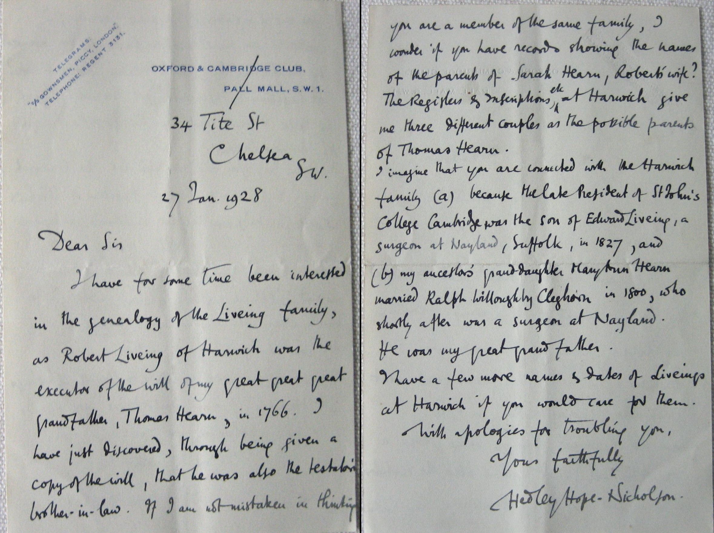 Oxford and Cambridge Club Pall Mall SW1 34 Tite st Chelsea SW 31 Jan 1928 Dear Sir Your nephew, Mr E. G. D Liveing, will no doubt have written to you, mentioning my enquiry about the Liveings of Harwich. I am specially anxious to know if you have any details about Sarah, wife of Robert Liveing, who must have been the sister of my great great great grandfather, Captain Thomas Hearn, R.N. She died in Page 1772, aged 49. There is some doubt as to which of three couples were the parents of Thomas Hearn, & perhaps the Liveing pedigree may settle this. His wife was an Ann, daughter of James Clements. I have notes as to Robert Liveing's parents, if you by any chance have not got them. I may be going to Harwich on Friday, to stay with the Carlyon-Hughes, who are a great genealogists. I might be able to look up some point for you in the Registers, if you desire? My wife tells me that a cousin of hers, Archie Napier, married a Miss Liveing, perhaps she is a relation of yours? Yours faithfully Hedley Hope-Nicholson