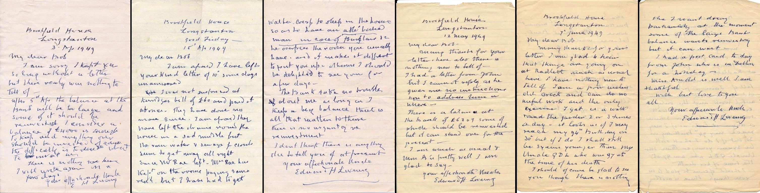 45. Letters 3 Apr 1949, 15 Apr 1949, 12 May 1949, 7 Jun 1949: Edward to Robert his nephew, 3 Apr 1949, Brookfield House Longstanton CAM. Liveing Archive 05 EHL Brookfield House Longstanton 3 April 1949 My dear Bob I am sorry I kept you so long without a letter but there really was nothing to tell of. After 5th of April the balance at the Bank will be too large and some of it should be reinvested I consider a balance of L4000 is enough to keep and anything over should be invested of course the difficulty is to decide what to invest in. There is nothing new here I will write again in a few days. Your affectionate Uncle E H Liveing