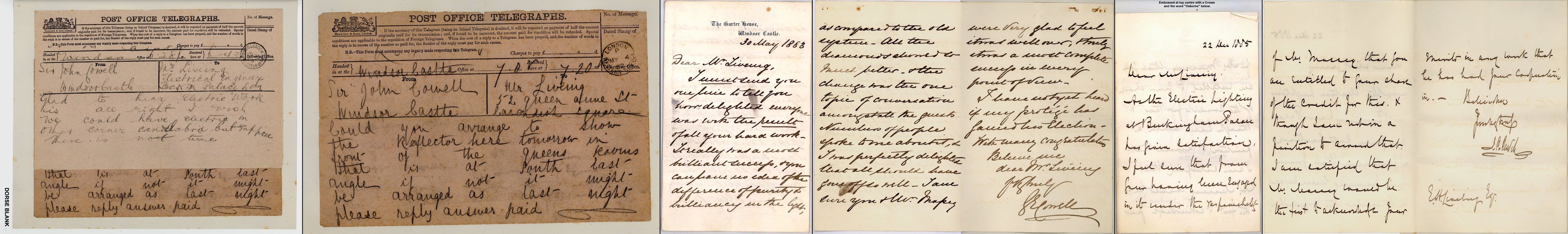 Post Office Telegraph's 6.28pm 23 Jul 1883 Windsor From Sir John Cowell Windsor Castle. To Mr Liveing Electrical Engineer Buckingham Palace Ldn. Glad to hear electric work is all right I wish we could have electric in other corner candelabra but suppose there is not time.