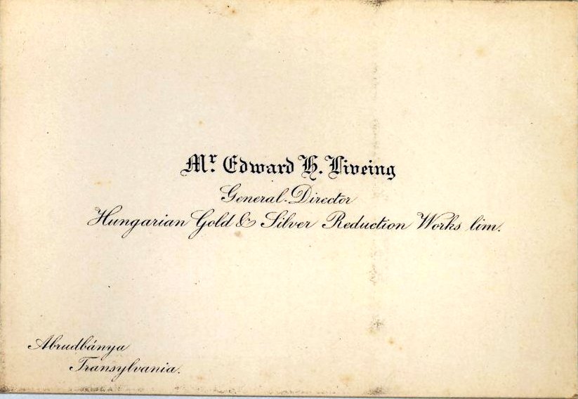9. Edward H T Liveing: This Paper given by Edward is on Gold Mining in Transylvania, 13 Feb 1886. Edward was involved in the Hungarian Gold & Silver Reduction Works Lim, at Abrudbanya, Transylvania late in the 19thC, at about this time he married Ida Erdebji a Hungarian.