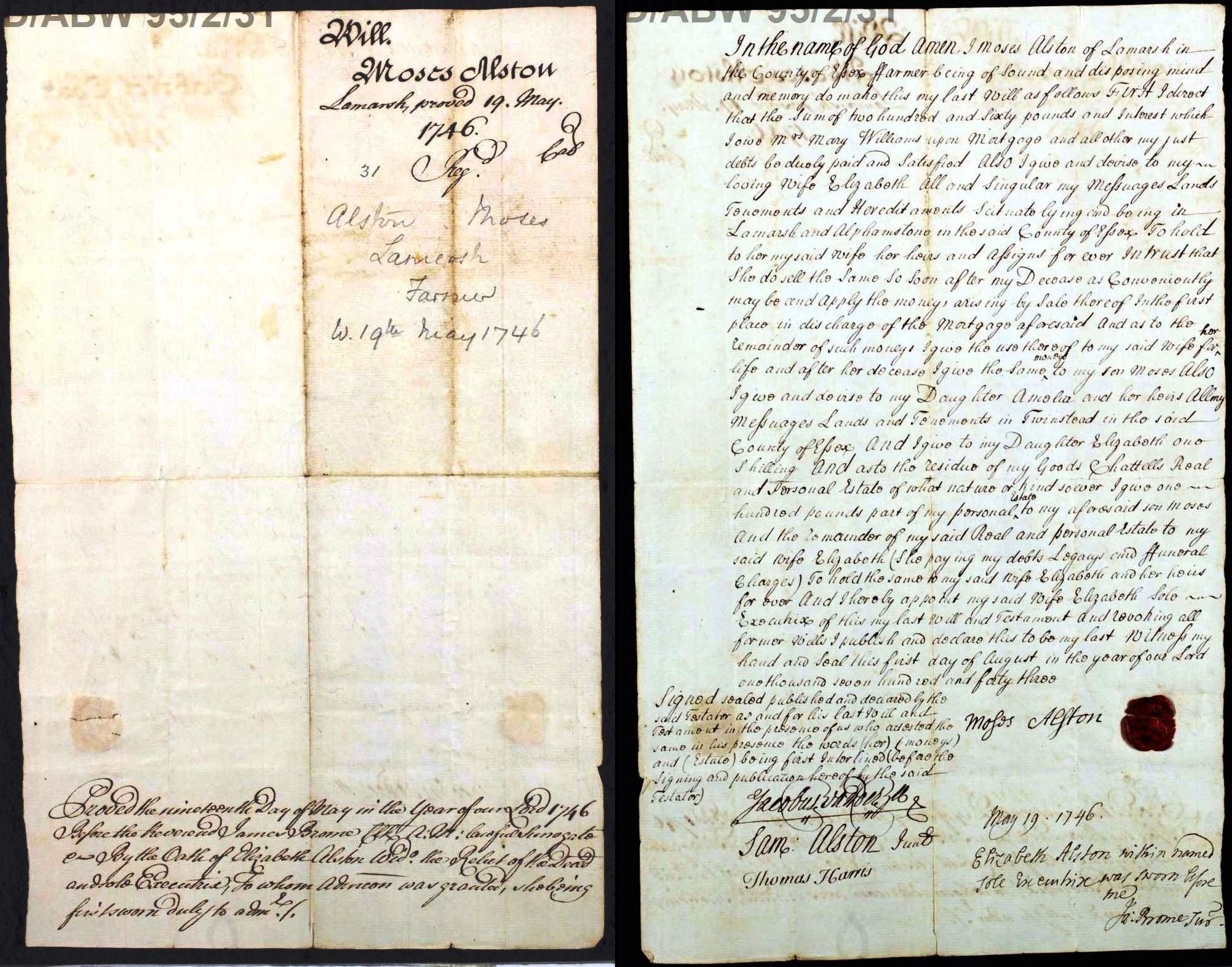 Will ESS PRO 1746 Moses Alston farmer of Lamarsh. Ref 203 BR 23. D/ABW 95/2/31
