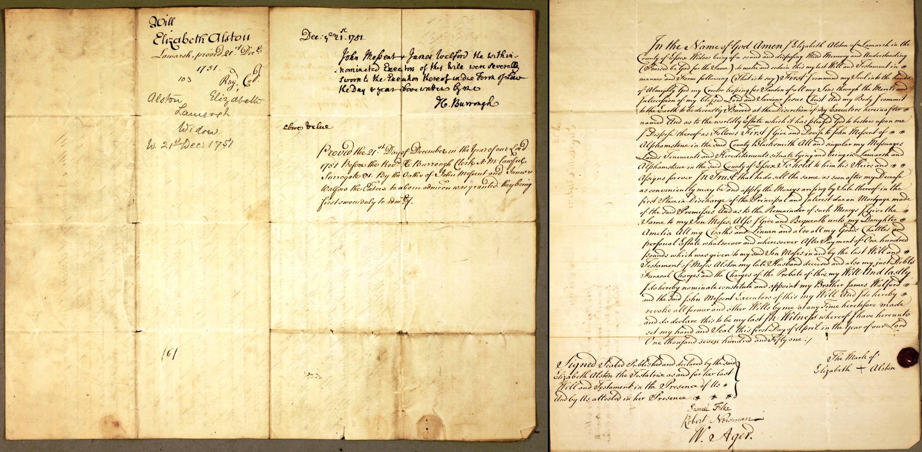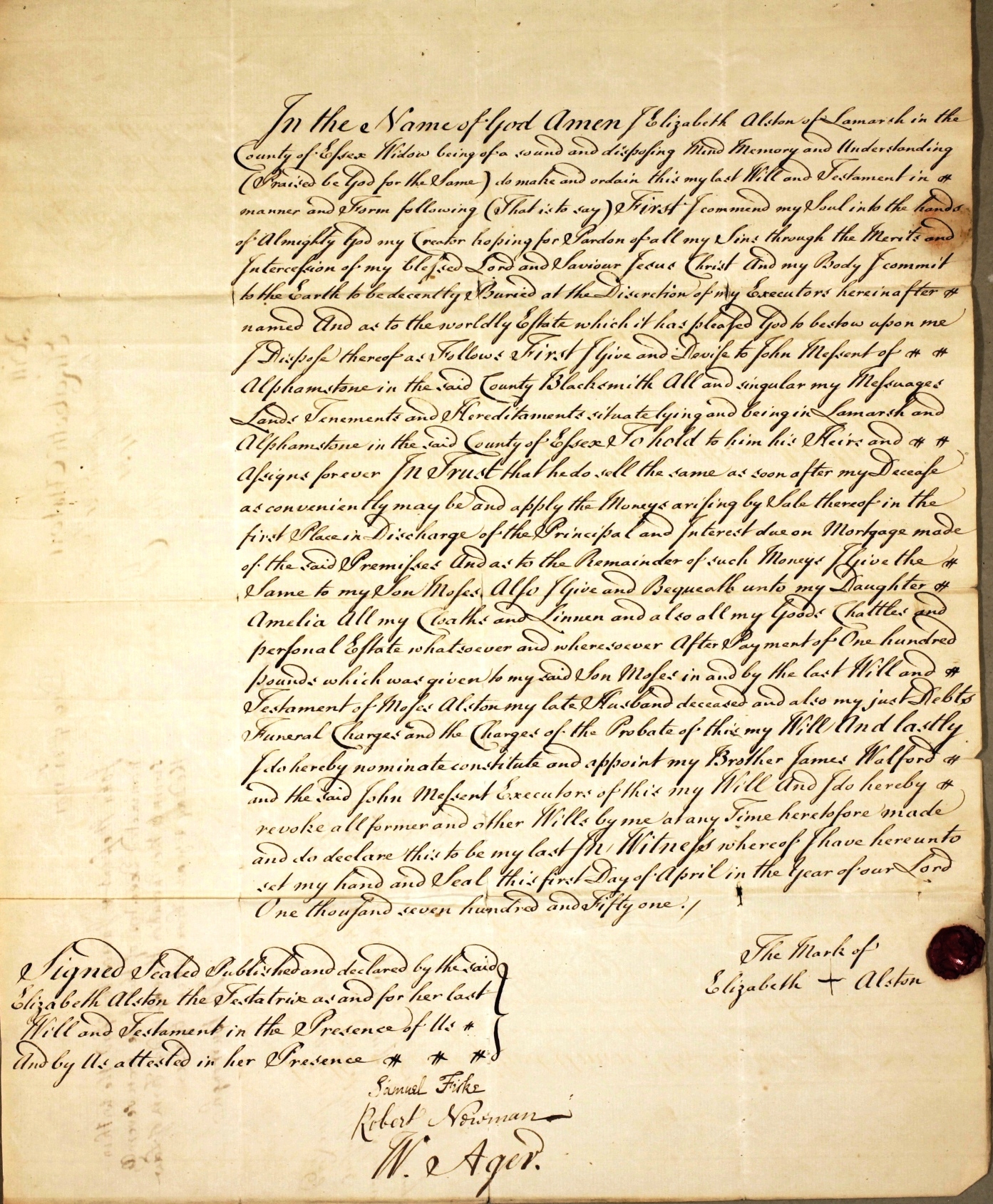 1. Elizabeth Walford: Will, 1 Apr 1751, Lamarsh ESS. Will of Elizabeth Alston 1 April 1751. Proved 21 Dec 1751. In the Name of God Amen I Elizabeth Alston of Lamarsh in the County of Essex Widow being of sound and disposing Mind Memory and Understanding (Praised be God for the Same) do make and ordain this my last Will and Testament in manner and form following (That is to say) First I commend my Soul into the hands of Almighty God my Creator hoping for Pardon of all my Sins through the Merits and Intercession of my blessed Lord and Saviour Jesus Christ And my Body I commit to the Earth to be decently Buried at the Discretion of my Executors hereinafter named And as to the worldly Estate which it has pleased God to bestow upon me I Dispose thereof as Follows First I Give and Devise to John Mefsent of Alphamstone in the said County Blacksmith All and singular my Messuages Lands Tenements and Hereditments situate lying and being in the Lamarsh and Alphamstone in the said County of Essex To hold to him his Heirs and Assigns forever In Trust that he do sell the same as soon after my Decease as conveniently may be and apply the Monies arising by Sale thereof in the first Place in Discharging of the Principal and Interest due on Mortgage made of the said Premises And as to the Remainder of such Monies I Give the Same to my Son Moses Also I Give and Bequeath unto my Daughter Amelia All my Clothes and Linen and also all my Goods Chattels and personal Estate whatsoever and wheresoever After Payment of One hundred pounds which was given to my said Son Moses in and by the last Will and Testament of Moses Alston my late Husband deceased and also my just Debts Funeral Charges and the Charges of the Probate of this my Will And lastly I do hereby nominate constitute and appoint my Brother James Walford and the said John Mefsent Executors of this my Will and I do hereby revoke all former and other Wills by me at any Time heretofore made and do declare this to be my last In Witness whereof I have hereunto set my hand and Seal this first Day of April in the year of our Lord One thousand seven hundred and Fifty one. The Mark + of Elizabeth Alston Signed Sealed Published and declared by the said Elizabeth Alston the Testatrix as and for her last Will and Testament in the Presence of Us And by Us attested in her Presence Samuel Fisk Robert Newman W Ager. Proved the 21st Day of December the Year of our Lord 1751 Before the Revd. H Burrough Clerk A.M. lawful Surrogate etc. And by the Oaths of John Messent and James Walford the Executors to whom administration was granted they being first sworn duly to Administer.