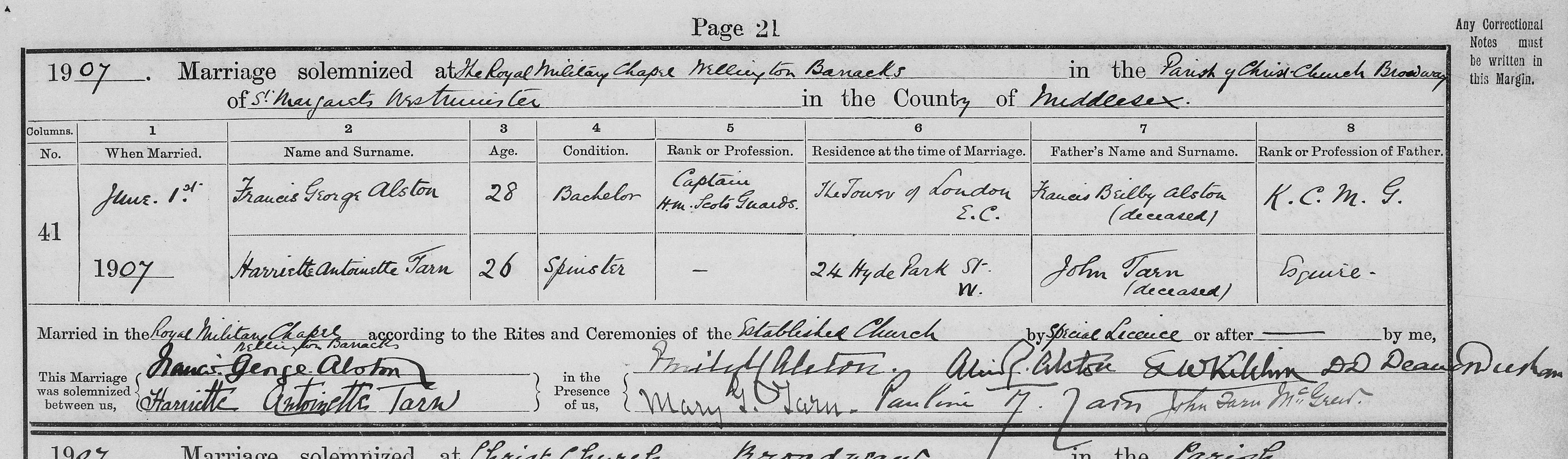1. Census: England, 31 Mar 1901, 24 Hyde Park St Paddington LND. Harriet is recorded as a daughter unmarried age 19 born St Germain France. 2. Census: England, 2 Apr 1911, 4 Chelsea Plc Hyde Park Sq Paddington LND. Harriet is recorded as a wife aged 29 married 3 yrs with 2 children both living born St Germain Paris France to British parents Harriet married Brig. Gen. Francis George ALSTON [4107] [MRIN: 2535], son of Sir Francis Beilby ALSTON K.C.M.G. J.P. [4091] and Lady Emily Louisa Caroline TAYLOR [4097], on 1 Jun 1907 in Royal Chapel Wellington Barracks Westminster. (Brig. Gen. Francis George ALSTON [4107] was born on 19 Jul 1878 in St George Hanover Sq and died on 10 Mar 1961 in Sandacre, Sandling, Hythe, KEN.) |