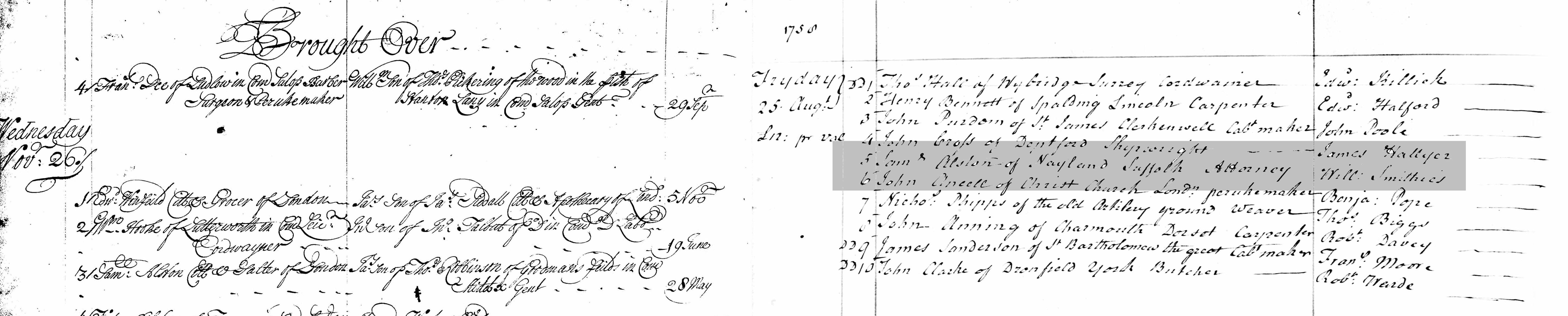 MINUTES OF NAYLAND COURT BARON. Elizabeth Gibbs widow was Lady of the Manor, then from 1739 Samuel & Elizabeth Gibbs, with Jacobus Vanderzee appointed Steward of the Manor. Samuel Alston sat as Deputy Steward in 1745, then Steward in 1746.