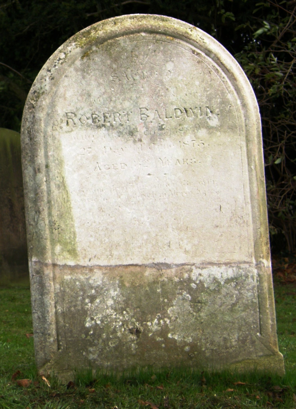 Headstone reads: Sacred to the Memory of Robert Baldwin who departed this Life 27th day of June 1875 aged 82 years . . . . .