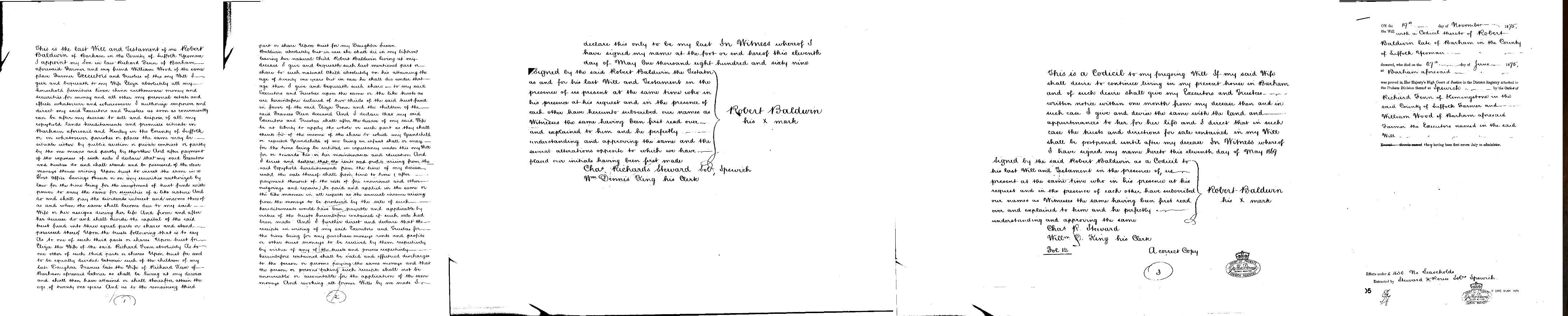 2. Robert Baldwin: Will, Probate, 1869. Will Robert Baldwin 11 May 1869 This is the last Will and Testament of me Robert Baldwin and of Barham in the County of Suffolk Yeoman I appoint my son-in-law Richard Fenn of Barham aforesaid farmer and my friend William Wood of the same place farmer Executors and Trustees of this my Will I give and bequeath to my Wife Eliza absolutely all my household furniture linen and china earthenware money and securities for money and all other my personal estate and effects whatsoever and wheresoever I authorise empower and direct my said Executors and Trustees as soon as conveniently can be after my decease to sell and dispose of all my Copyhold lands Hereditments and premises situate in Barham aforesaid and Henley in the County of Suffolk or in whatsoever parishes or places the same may be situate either by public auction or private contract or partly by the one means and partly by the other And after payment of the expenses of such sale I declare that my said Executors and Trustees do and shall stand and be possessed of the clear monies thence arising Upon trust to invest the same in a Post Office Savings Bank or on any Securities authorised by law for the time being for the investment of trust funds with power to vary the same for Securities of a like nature And do and shall pay the dividends interest and income thereof as and when the same shall become due to my said Wife or her assigns during her life And from and after her decease do and shall divide the capital of the said trust fund into three equal parts or shares and stand possessed thereof Upon the trusts following that is to say As to one of such third parties or shares Upon trust for and to be equally divided between such of the children of my daughter Frances late the wife of Richard Keen of Barham aforesaid labourer as shall be living at my decease and shall then have attained or shall thereafter attain the age of twenty one years And as to the remaining third part or share Upon trust for my daughter Susan but in case she shall die in my lifetime leaving her natural child Robert Baldwin living at my decease I give and bequeath such last mentioned part or share to such natural child absolutely on his attaining the age of twenty one years but in case he shall die under that age then I give and bequeath such share to my said executors and trustees upon the same or the like trusts as our hereinbefore declared of two thirds of the said trust for in favour of the said Eliza Fenn and the children of the said Francis Keane deceased And I declare that my said executors and trustees shall after the decease of my said wife be at liberty to apply the whole all such part as they shall think fit of the income of the share to which my grandchild or reputed grandchild of me being an infant shall or may for the time being be entitled in expectancy under this my Will for or towards his or her maintenance and education And I direct and declare that the rents and profits arising from the said Copyhold Hereditments from the time of my decease until the sale thereof shall from time to time (after payment thereof of the costs of fire insurance and other outgoings and repairs) be paid and applied in the same or the like manner in all respects as the annual income arising from the monies to be produced by the sale of such Hereditments would have been payable and applicable by virtue of the trusts hereinbefore contained if such sale had been made And I further directed declare that the receipts in writing of my said executors and trustees for the time being for any purchase moneys rents and profits or other trust monies to be received by them respectively by virtue of any of the trusts and powers respectively hereinbefore contained shall be valid and effectual discharges to the person or persons paying the same monies and that the person or persons taking such receipts shall not be answerable or accountable for the application of the same monies And revoking all former Wills by me made I declare this only to be my last In witness whereof I have signed my name at the foot or end hereof this eleventh day of May one thousand eight hundred and sixty nine. Robert Baldwin his X mark