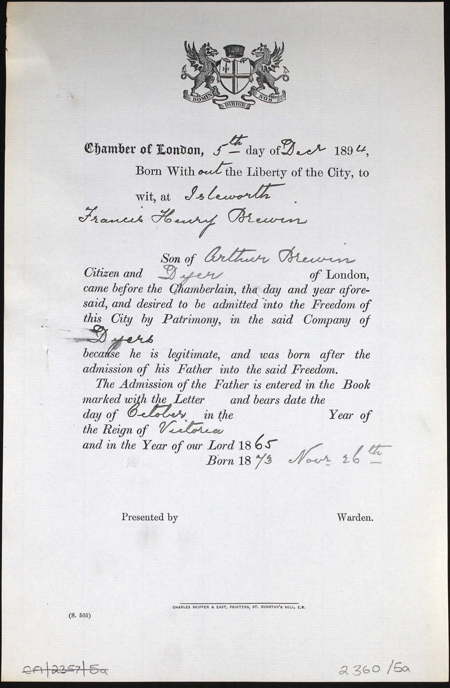 3. Freedom of City of London: Dyers Company, 5 Dec 1894.