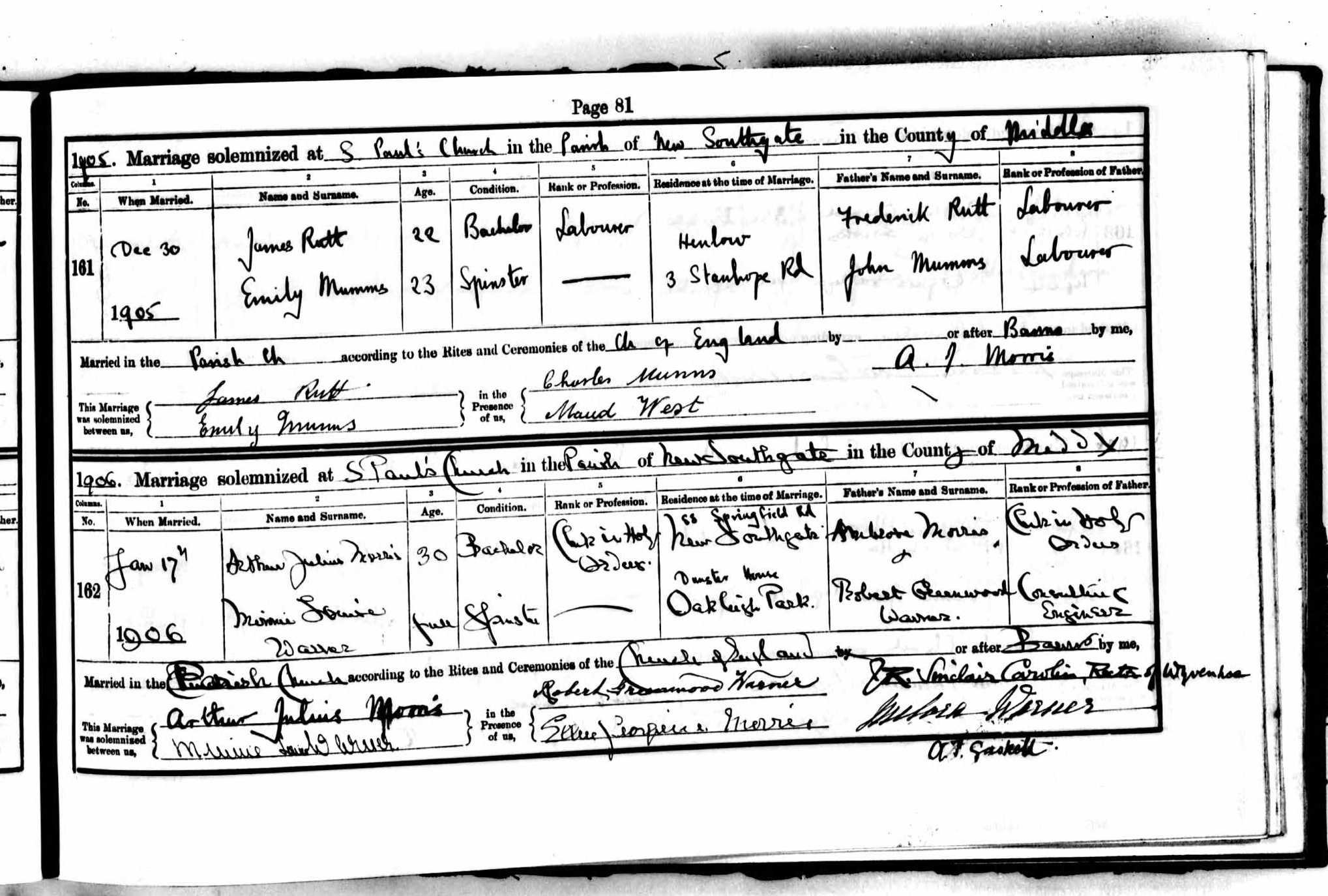 Arthur married Matilda Louise WARNER [1117] [MRIN: 354], daughter of Robert Greenwood WARNER [22755] and Unknown, on 17 Jan 1906 in St Paul New Southgate MDX. (Matilda Louise WARNER [1117] was born about 1874 in Chichester SSX.)