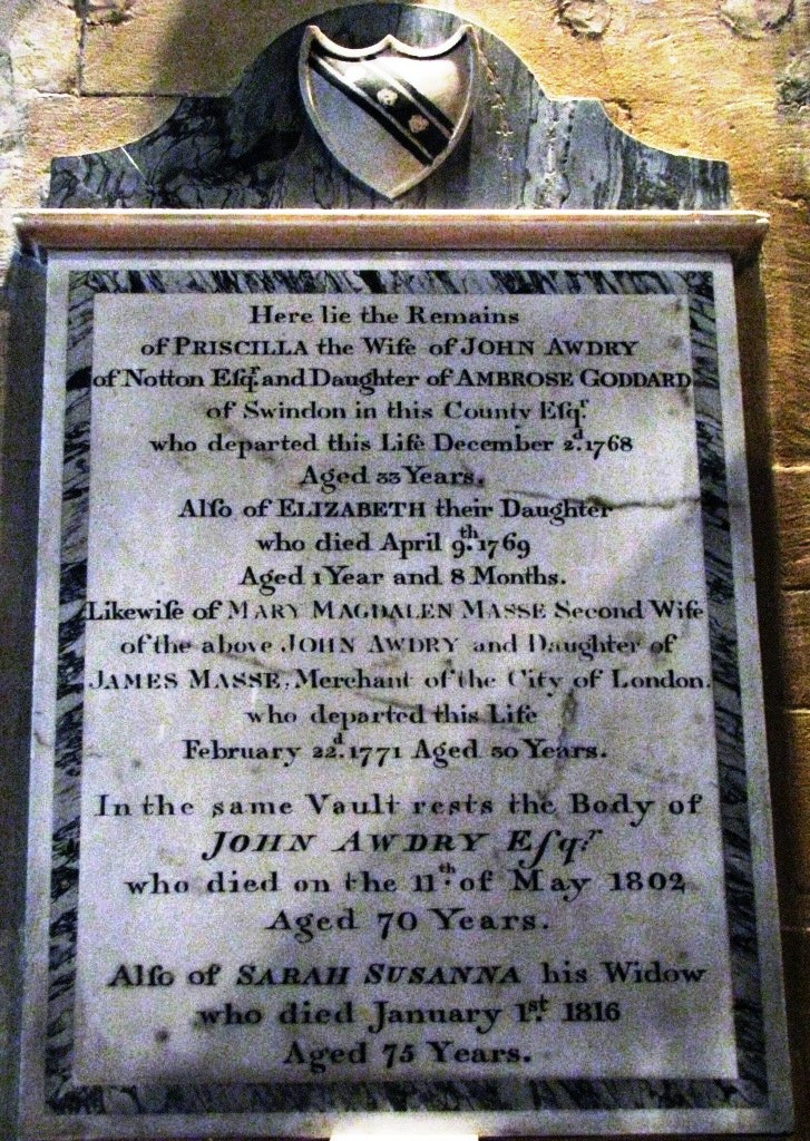 Mary married John AWDRY Esq of Notton [11977] [MRIN: 4026], son of Ambrose AWDRY of Seend [11982] and Jane AWDRY [11983], on 12 Mar 1770 in Laycock WIL. (John AWDRY Esq of Notton [11977] was born on 30 Sep 1732 in Seend WIL, baptised on 27 Oct 1732 in Seend WIL, died on 11 May 1802 and was buried in Seend WIL.) |