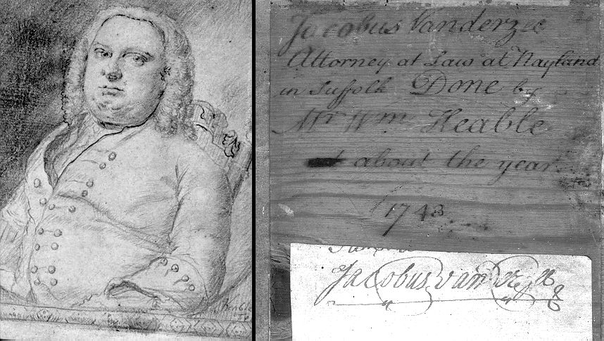 Portrait by William Keable of Jacobus dated 1743 in possession E L Fenn Auckland NZ 1998. William Keable was a barber and peruke (wig) maker of Nayland, Jacobus was his client in 1731. This important portrait with others, was purchased in 1898 by Dr Edward L Fenn MD from Charles Barron Alston of Chatham who being rather in extremus for cash, would "gladly exchange for coin of the realm" to Dr Fenn