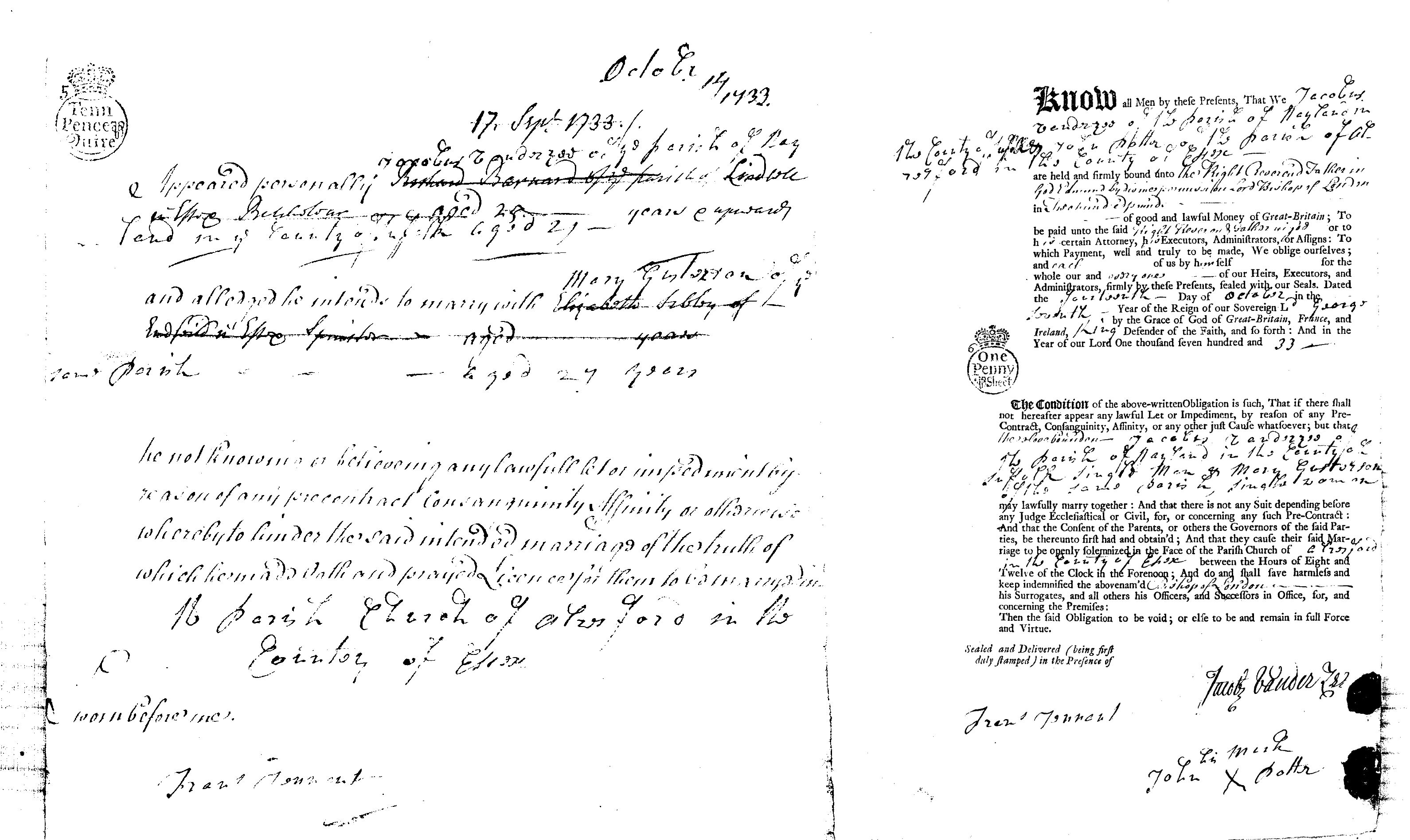 Marriage Licence Bond KNOW all men by thefe prefents That We Jacobus Vanderzee of the parish of Nayland in the County of Suffolk and John Potter of the parish of Alresford in the County of Essex are held and firmly bound unto the Right Reverend Father in God Edmund by divine permission Lord Bishop of London; in Two Hundred Pounds of good and lawful money of Great Britain; To be paid under the faid Right Reverend and Father in God or to his certain Attorney his executors adminiftrators or affigns: To which payment well and truly to be made, We oblige ourfelves; and each of us by him felf for the whole our and everyones of our Heirs Executors and Adminiftrators firmly by thefe Prefents fealed with a seals. Dated the fourteenth day of October in the seventh year of the Reign of a Sovereign Ld George by the Grace of God of Great Britain, France, and Ireland, King defender of the Faith and fo forth: And in the year of our Lord One thoufand feven hundred and thirty three. The condition of the above written Obligation is fuch, That if there fhall not hereafter appear any lawful Let or Impediment by reafon of any Pre-Contract, Consanguinity, Affinity, or any other juft caufe whatfoever; but that the above bounden Jacobus Vanderzee of the parish of Nayland in the County of Suffolk single man and Mary Gusterson of the same parish single woman may lawfully marry together: and that there is not any Suit depending before any Judge ecclefiaftical or Civil, for, or concerning any fuch Pre-Contract: And that the confent of the Parents, or others the Governors of the faid Parties, be thereunto firft had and obtained; And that they caufe the faid Marriage to be openly folemnised in the Face of the Parish Church of Alresford in the County of Essex between the Hours of Eight and Twelve of the Clock in the Forenoon; And do and fhall fave harmlfs and keep indemnified the abovenam'd Bishop of London his Surrogates and all others his Officers and Succeffors in Office, for, and concerning the Premifes: Then the faid obligation to be void; or elfe to be and remain in full Force and Virtue. Sealed and Delivered (being first duly stamped) in the presence of Francis Tennent Jacobus Vanderzee John Potter his mark. Copy on file.