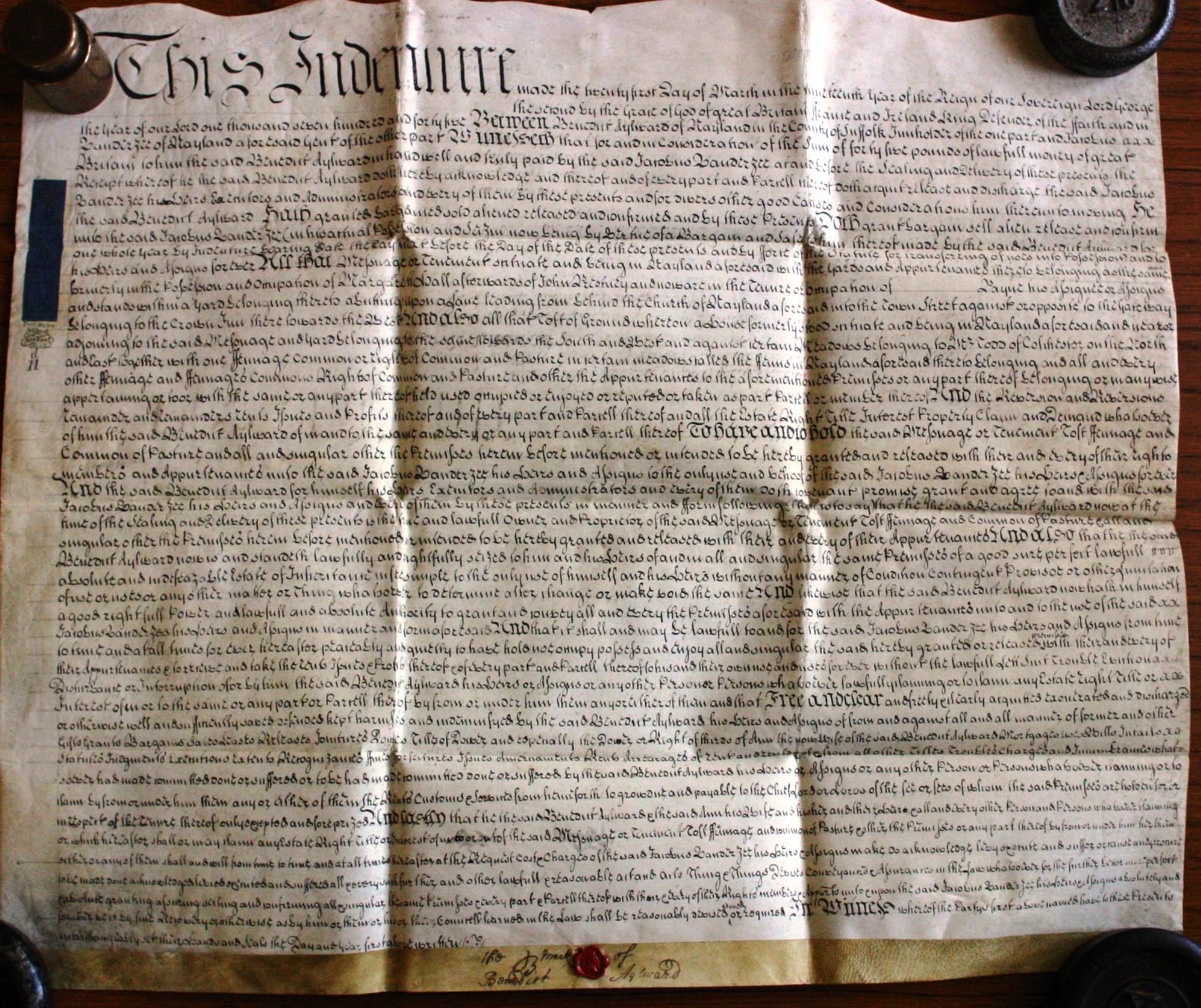 This indenture made the twenty first day of March in the nineteenth year of the reign of our sovereign lord George the Second by the grace of God of Great Britain, France, and Ireland, king defender of the faith and in the year of our lord one thousand seven hundred and forty five between Benedict Aylward of Nayland in the county of Suffolk innholder of the one part and Jacobus Vanderzee of Nayland aforesaid Gent of the other part witnesseth that for and in consideration of the sum of forty five pounds of lawful money of Great Britain to him the said Benedict Aylward in hand well and truly paid by the said Jacobus Vanderzee at and before the sealing and delivery of these presents the receipt whereof he the said Benedict Aylward doth hereby acknowledge and thereof and of every part and parcel thereof doth acquit, release, and discharge the said Jacobus Vanderzee his heirs, executors, and administrators, and every of them by these presents and for diverse and other good causes and considerations him thereunto moving he the said Benedict Aylward hath granted, bargained, sold, aliened, released, and confirmed and by these presents doth grant, bargain, sell, alien, release, and confirm unto the said Jacobus Vanderzee (in his actual possession and seisin now being by virtue of a bargain and sale to him thereof made by the said Benedict Aylward for one whole year by indenture bearing date the day next before the day of the date of these presents and by force of the statute for transferring of uses into possession and to his heirs and assigns forever all that messuage or tenement situate and being in Nayland aforesaid with the yards and appurtenances thereto belonging as the same formerly in the possession and occupation of Margaret Hall afterwards of John Restuey and now are in the tenure or occupation of [blank space] Payne his assignee or assigns and stands within a yard belonging thereto abutting upon a lane leading from behind the church of Nayland aforesaid into the town street against or opposite to the gateway belonging to the Crown Inn there towards the west and also all that toft of ground whereon a house formerly stood situate and being in Nayland aforesaid and near or adjoining to the said messuage and yard belonging to the same towards the south and west and against certain meadows belonging to Mr . Todd of Colchester on the north and east together with one fennage common or right of common and pasture in certain meadows called the Fenns in Nayland aforesaid thereto belonging and all and everyother fennage and fennages, commons, rights of common and pasture and other the appurtenances to the aforementioned premises or any part thereof belonging or in anywise appertaining or to or with the same or any part thereof held, used, occupied, or enjoyed or reputed or taken as part, parcel, or member thereof and the reversion and reversions, remainder and remainders, rents, issues, and profits thereof and of every part and parcel thereof and all the estate, right, title, interest, property, claim, and demand whatsoever of him the said Benedict Aylward of, in, and to the same and every or any part and parcel thereof to have and to hold the said message or tenement, toft, fennage, and common of pasture and all and singular other the premises hereinbefore mentioned or intended to be hereby granted and released with their and every of their rightmembers and appurtenances unto the said Jacobus Vanderzee his heirs and assigns to the only use and behoof of the said Jacobus Vanderzee his heirs and assigns forever and the said Benedict Aylward for himself, his heirs, executors, and administrators and every of them doth covenant, promise, grant, and agree to and with the said Jacobus Vanderzee, his heirs and assigns and every of them by these presents in manner and form following that is to say that the said Benedict Aylward now at the time of the sealing and delivery of these presents is the true and lawful owner and proprietor of the said messuage or tenement, toft, fennage and common of pasture and all and singular other the premises hereinbefore mentioned or intended to be hereby granted and released with their and every of their appurtenances and also that he the said Benedict Aylward now is and standeth lawfully and rightfully seised to him and his heirs of and in all and singular the same premises of a good, sure, perfect, lawful, absolute, and indefeasible estate of inheritance in fee simple to the only use of himself and his heirs without any manner of condition, contingent, proviso, or other limitation of use or uses or any other matter or thing whatsoever to determine alter change or make void the same and likewise that the said Benedict Aylward hath in himself a good right, full power, and lawful and absolute authority to grant and convey all and every the premises aforesaid with the appurtenances unto and to the use of the said Jacobus Vanderzee, his heirs and assigns in manner and form aforesaid and that it shall and may be lawful to and for the said Jacobus Vanderzee his heirs and assigns from time to time and at all times forever hereafter peaceably and quietly to have, hold, use, occupy, possess, and enjoy, all and singular the said hereby granted or released premises with their and every of their appurtenances and to receive and take the rents, issues, and profits thereof and of every part and parcel thereof to his and their own use and uses forever without the lawful let, suit, trouble, eviction, disturbance or interruption of or by him the said Benedict Aylward his heirs or assigns or any other person or persons whatsoever lawfully claiming or to claim any estate, right, title or interest of, in or to the same or any part or parcel thereof by, from or under him, them, any or either of them and that free and clear and freely and clearly acquitted, exonerated, and discharged or otherwise well and sufficiently saved, defended, kept harmless, and indemnified by the said Benedict Aylwar