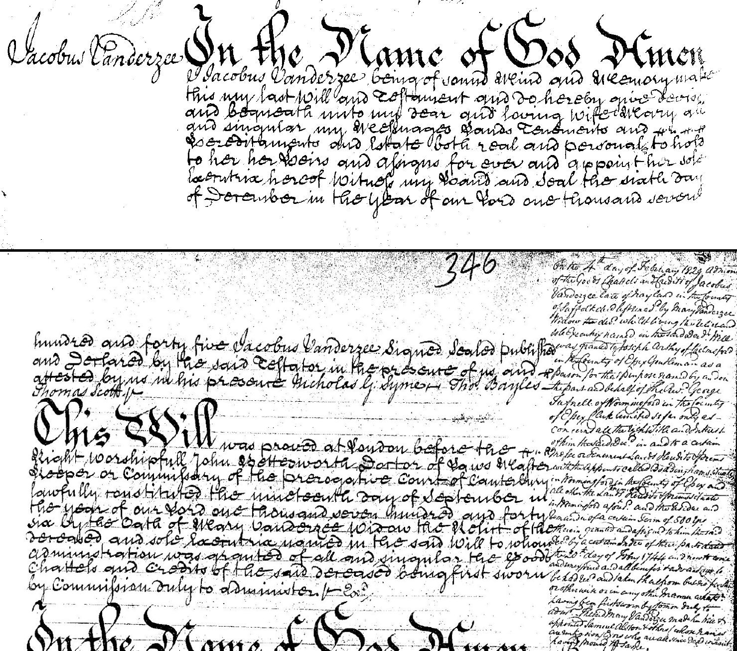 The Will of Jacobus Vanderzee Dated 6 Dec 1745. In the name of God Amen I Jacobus Vanderzee being of sound mind and memory make this my last Will and Teftament and do hereby give devise and bequeath unto my dear and loving wife Mary all singular my mefsuages lands tenements and hereditaments and estate both real and personal to hold to her her heirs and afsigns for ever and appoint her sold executrix hereof Witnefs my hand and seal the sixth day of December in the year of our Lord 1745. Signed Jacobus Vanderzee Signed sealed publifhed and declared by the said teftator in the presence of us and attested by us in his presence. Nicholas G Syme, Thomas Bayles, Thomas Scott. This Will was proved at London before the right worshipful John Rettesworth Doctor of Laws Master Keeper or Commifsary of the Perogative Court of Canterbury lawfully constituted the nineteenth day of September in the year of our Lord 1746 by the oath of Mary Vanderzee widow the Relict of the deceased and sole executrix named in the said Will to whom administration was granted of all and singular the goods chattels and credits of the said deceased being first sworn by commifsion duly to administration.