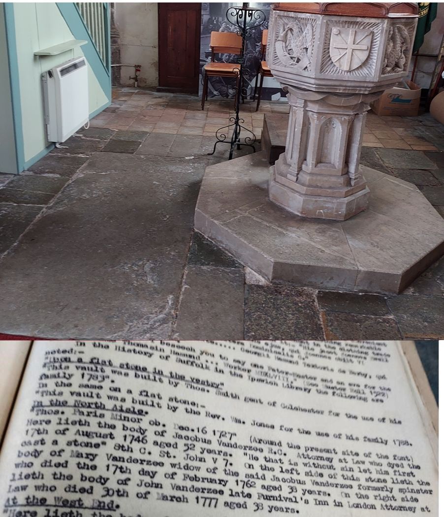 7. Vanderzee Grave, 1746, Nayland Church SFK. Pauline Vanderzee writes 2022 of a visit to Nayland Church. "A kind church warden showed us old photograph albums and registers of the church and village. We saw the slab to the left of the font, but as you discovered only a few words and letters are legible. However, someone had recorded the inscriptions of the flagstones many years ago in a register when the letters were visible. I'm attaching the photos I took of the slab beneath which not only Mary but her husband Jacobus are buried, and of the inscription."