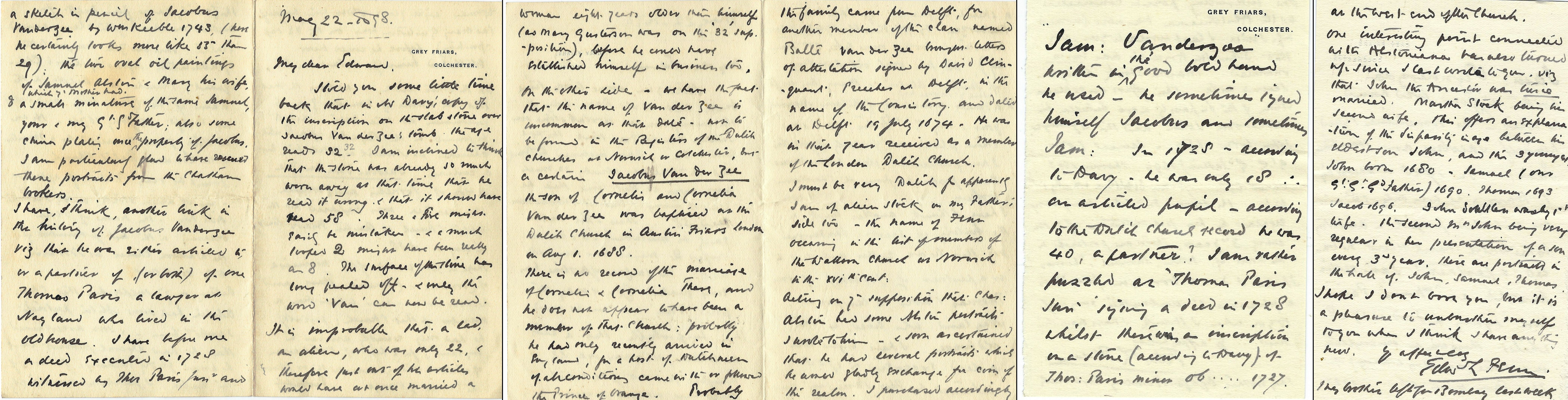 Grey Friars Colchester May 22 1898. My dear Edward, I told you some time back that in W Davy's copy of the inscription on the slab stone over Jacobus Vanderzee's tomb the age reads 32. I am inclined to think that the stone was already so much worn away at that time that he read it wrong, and that it should have read 58. 3 and 5 might easily be mistaken and a much copied 2 might have been really and 8. The surface of the time has long peeled off and only the word Van can now be read. It is improbable that a lad, an alien, who was only 22, and therefore just out of his articles would have at once married a Page 2 woman 8 years older than himself (as Mary Gusterson was on the "32" supposition), before he could have established himself in business too. On the other side we have the fact that the name of Van der Zee is uncommon at that date, not to be found in the registers of the Dutch churches at Norwich or Colchester, but a certain Jacobus Van der Zee the son of Cornelius and Cornelia Van der Zee was baptised at the Dutch church in Austin Friars London on August 1, 1688. There is no record of the marriage of Cornelius and Cornelia there, and he does not appear to have been a member of that Church: probably he had only recently arrived in England, for a host of Dutchman of all conditions came with or followed the Prince of Orange. Probably Page 3 the family came from Delft, for another member of the clan named Balle Van der Zee brought letters of attestation signed by David Clinquant, Preacher at Delft, in the name of the Consistory and dated at Delft 19 July 1674. He was in that year received as a member of the London Dutch Church. I must be very Dutch for apparently I am of alien stock on my father's side to \endash the name of Fenn occurring in the last of members of the Walloon church in Norwich in the XVIth Cent. Acting on your supposition that Charles Alston had some Alston portraits I wrote to him \endash and soon ascertained that he had several portraits which he would gladly exchange for coin of the realm. I purchased accordingly Page 4. a sketch in pencil of Jacobus Vanderzee by William Keeble 1743 (here he certainly looks more like 55 than 29), the 2 oval oil paintings of Samuel Alston and Mary his wife, which your mother had, and a small miniature of the same Samuel your and my Gt G Father; also some china plates once the property of Jacobus, I am particularly glad to have rescued these portraits from the Chatham brokers. I have I think another link in the history of Jacobus Vanderzee viz that he was either articled to or a partner of (or both) of one Thomas Paris a lawyer at Nayland who lived in the old house. I have before me a deed executed in 1728 witnessed by Thom Paris Jnr and Page 5. Jam: Vanderzee written in the good bold hand he used \endash he sometimes signed himself Jacobus and sometimes Jam: in 1728 \endash according to Davy \endash he was only 18 an articled pupil \endash according to the Dutch Church record he was 40, a partner ? I am rather puzzled as Thomas Paris Jun signed a deed in 1728 whilst there was an inscription on a stone (according to Davy) of Thos Paris minor ob . . . . . 1727. Page 6. at the West End of the church, one interesting point connected with Alstoniana has also turned up since I last wrote to you viz that John the ancestor was twice married. Martha Stock being his 2nd wife, this offers an explanation of the disparity in age between his eldest son John, and the 3 younger John born 1680 \endash Samuel (our Gt Gt Gt Grandfather) 1690 Thomas 1693 Jacob 1696. John doubtless was by 1st wife. It seems Mrs John being very regular in her presentation of a son every 3rd year, there are portraits in the hall of John, Samuel, Thomas. I hope I don't bore you but it is a pleasure to unburden myself to you when I think I have anything new. Yours affectionately Edw L Fenn My brother (Ernest Harrold Fenn) left for Bromley last week.